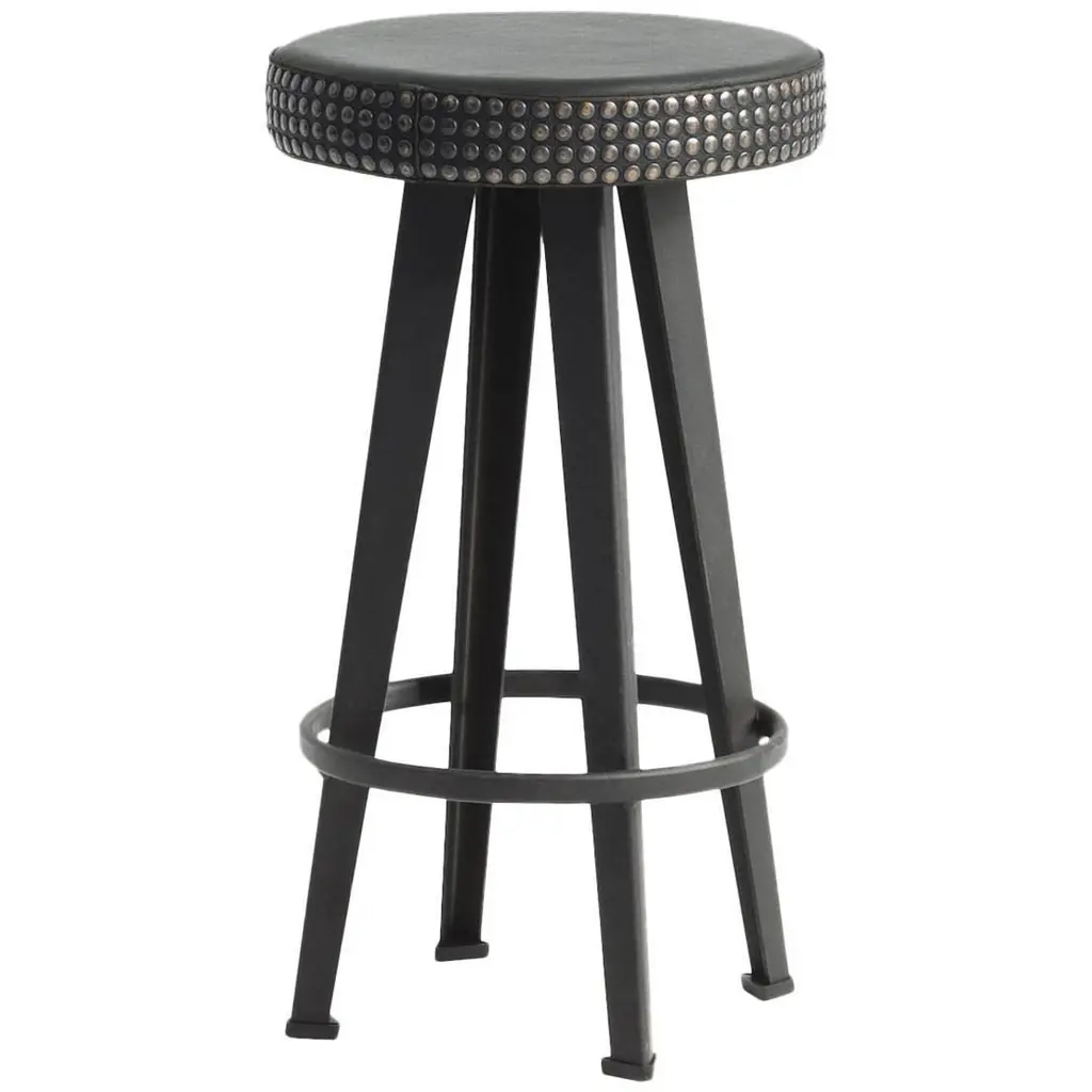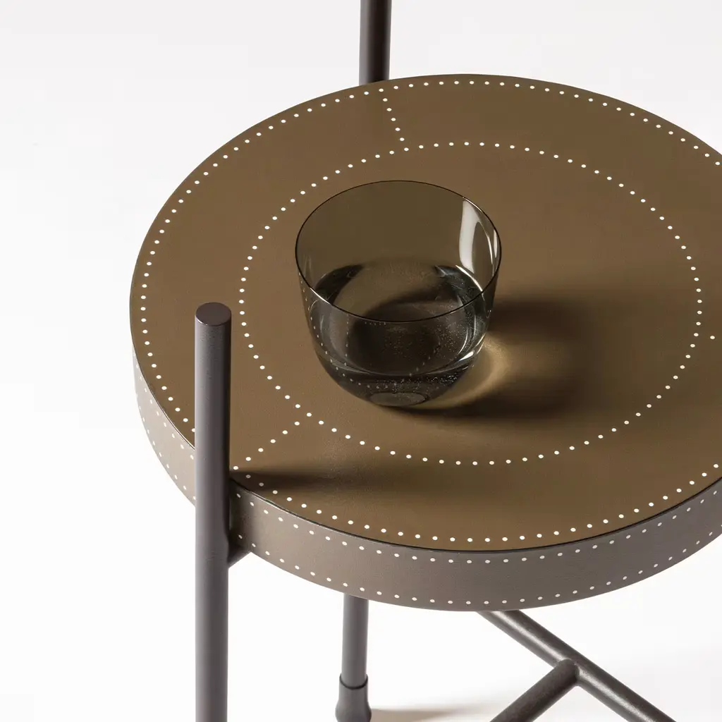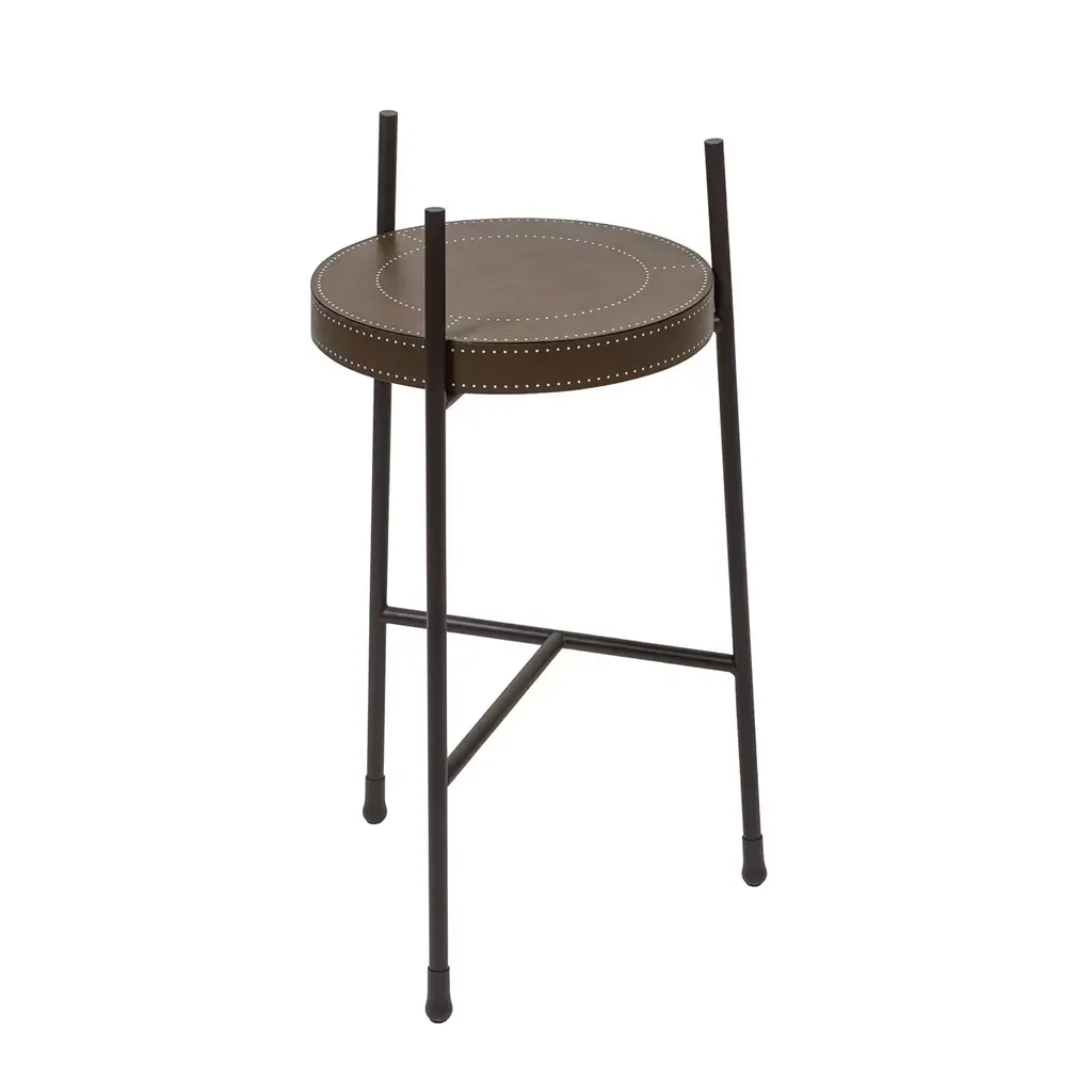 Distinguished by a dark leather top adorned with white stitching, this round side table effortlessly redefines spaces with its captivating blend of form and function. Crafted with slim burnished bronze legs, it exudes timeless sophistication while seamlessly blending organic textures with contemporary aesthetics. Ideal as a standalone statement piece or part of an exquisite pair in a living room or kitchen area.