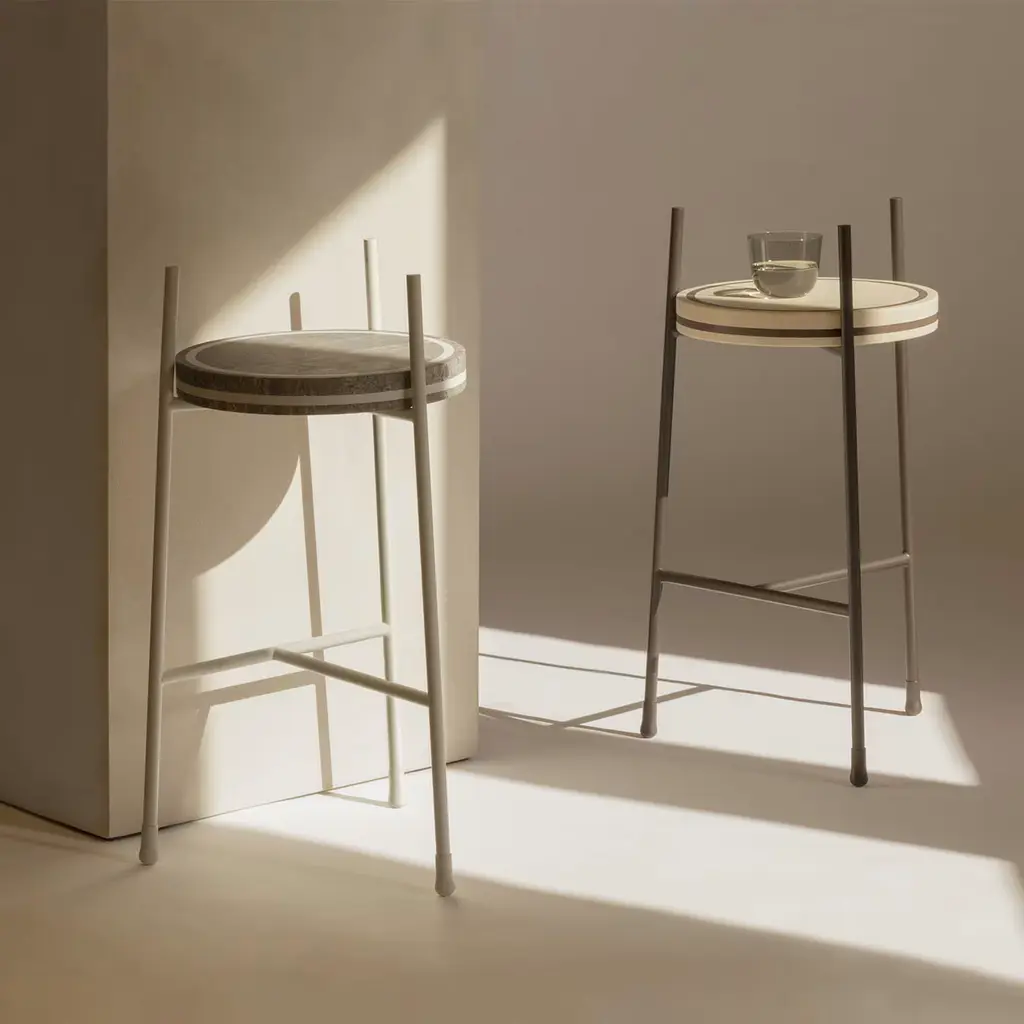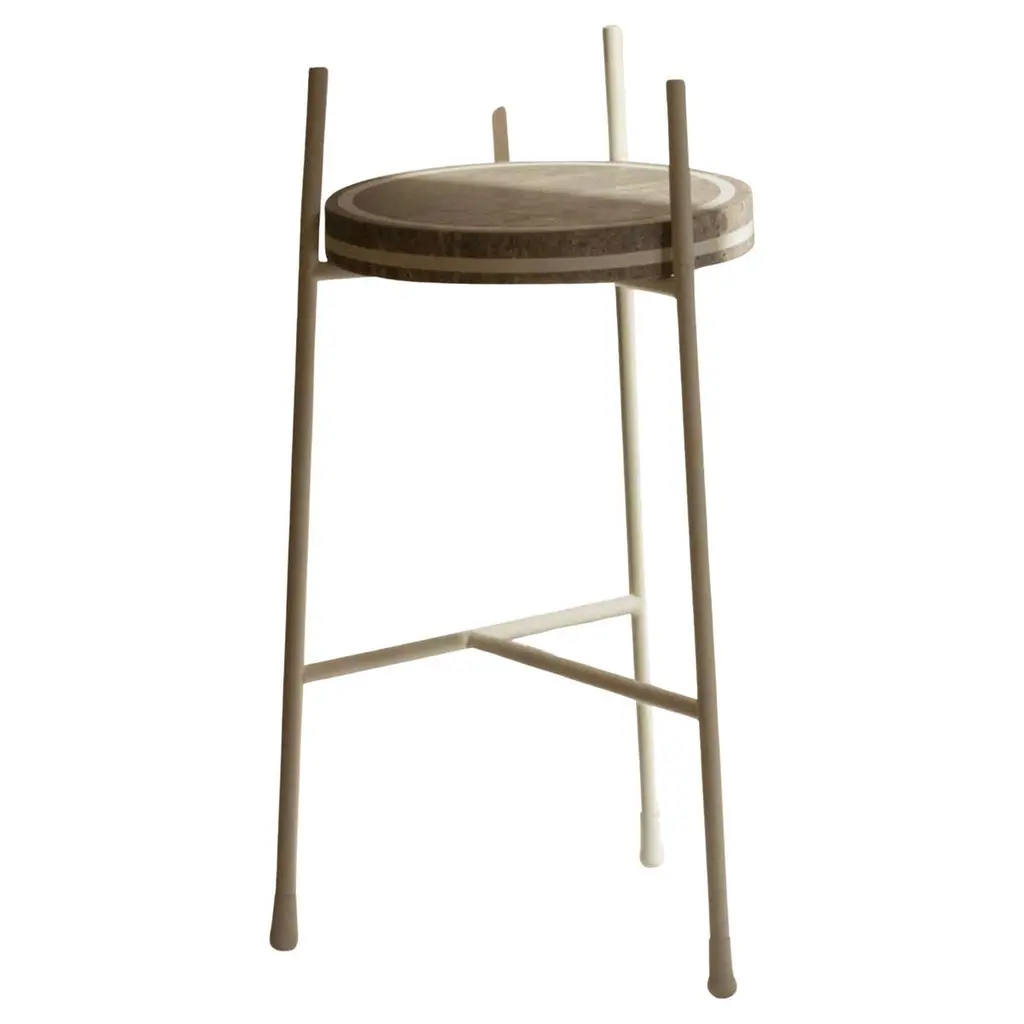 A testament to the seamless combination of aesthetic form and function, this singular side table will make for a timeless and sophisticated accent to a contemporary interior. Handmade into a sleek organic shape, it features slim metal legs seemingly defying gravity, lifting the round travertine top in suspension. Enriched with colored details, it is customizable in travertine shade, as well as metal finishes of the frame. Please consult the Concierge for details.