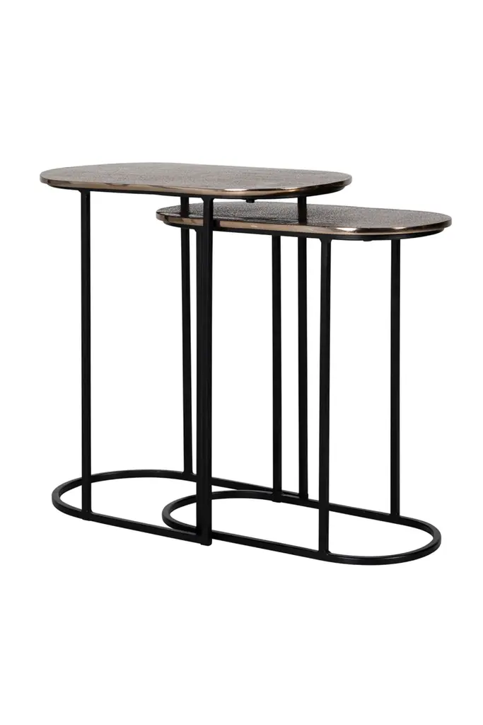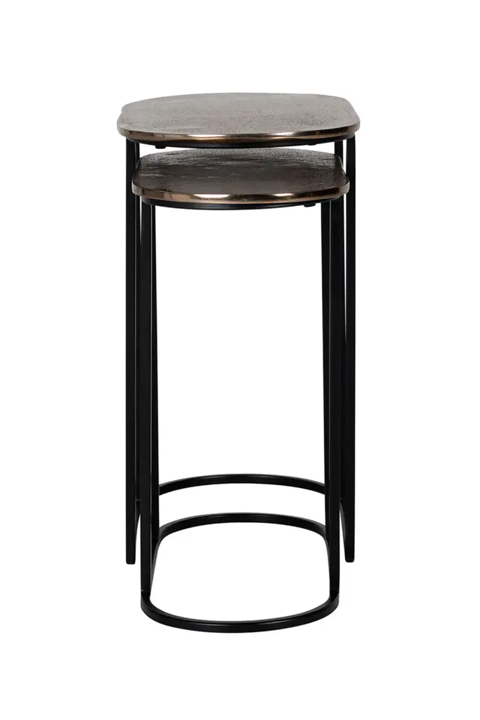 Oozing with industrial flair, the Chandon set of two end tables by Richmond Interiors, one tucked neatly inside the other. Featuring oblong aluminum tabletops that look like they have been sanded and black iron bases, these functional pieces will also add some visual character in your interior.