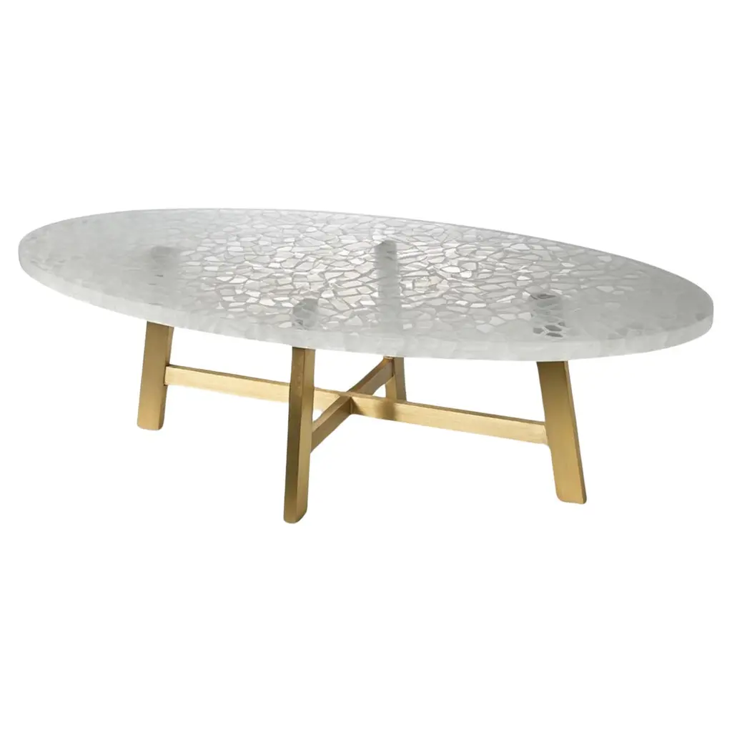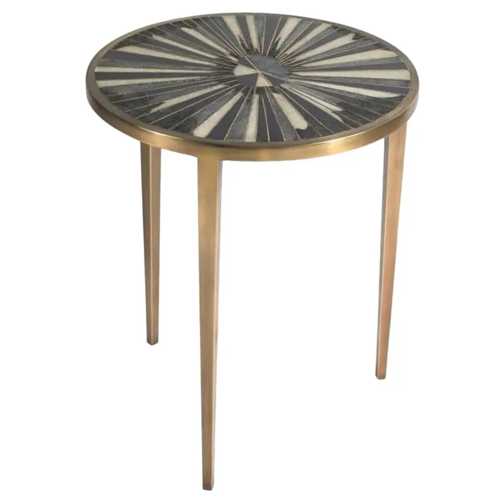 How society rejoiced when Art Deco dared to create a new approach to life, breathing fresh life into architecture, fashion, and art. Its spirit continues to endure and remains visible in the city of Bombay, home to one of the largest numbers of Art Deco buildings in the world. Of particular beauty are its famed cinema halls, after which these objects are named—a homage to the enduring beauty of an era that dared to dream anew.Side table in brass with semi precious inserts. Handmade in India.Product DetailsMaterial: BrassInlay: Ocean JasperSize: 16"DIA x 16"H 40.6 DIA x 40.6 H cmWeight: 10.14 kg 22.308 lbsNumber of Pieces: 1 Side TableSKU: VST151This product has been handcrafted by local artisans. As such, slight variations are a testament to the unique character of a piece made by hand.
