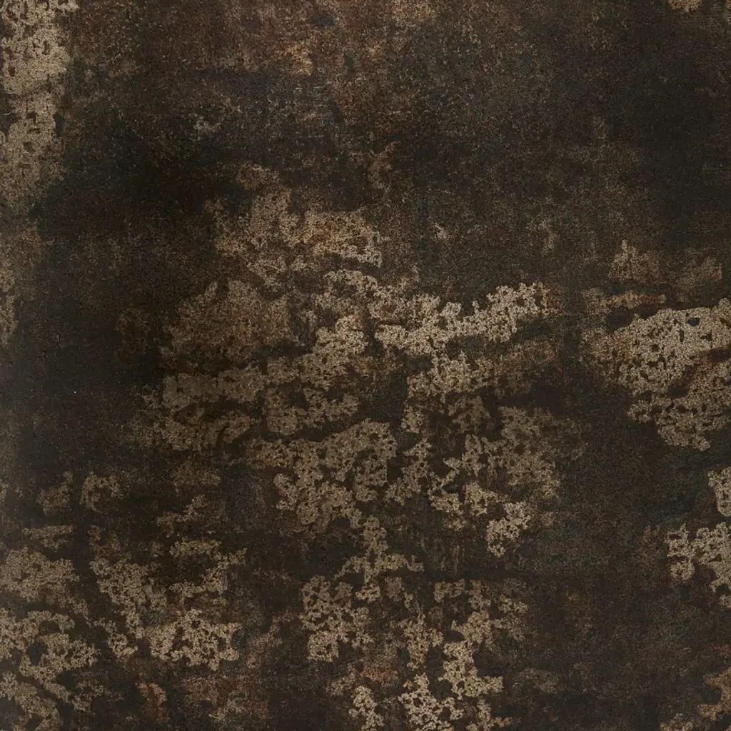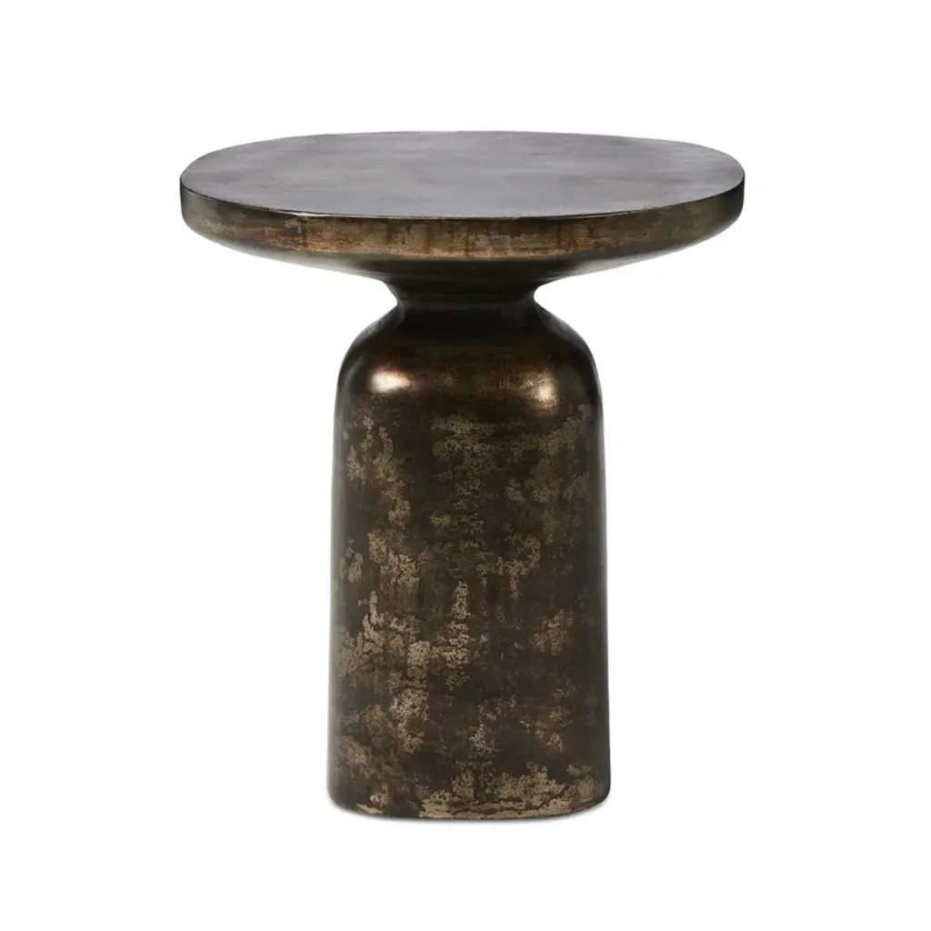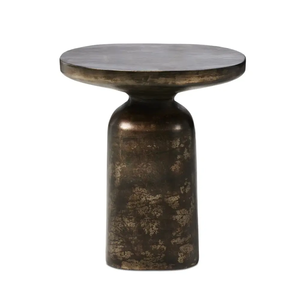 Forged from cast iron with a distressed bronze patina finish. A sturdy pedestal base and rounded square top create a functional, industrial-inspired piece.