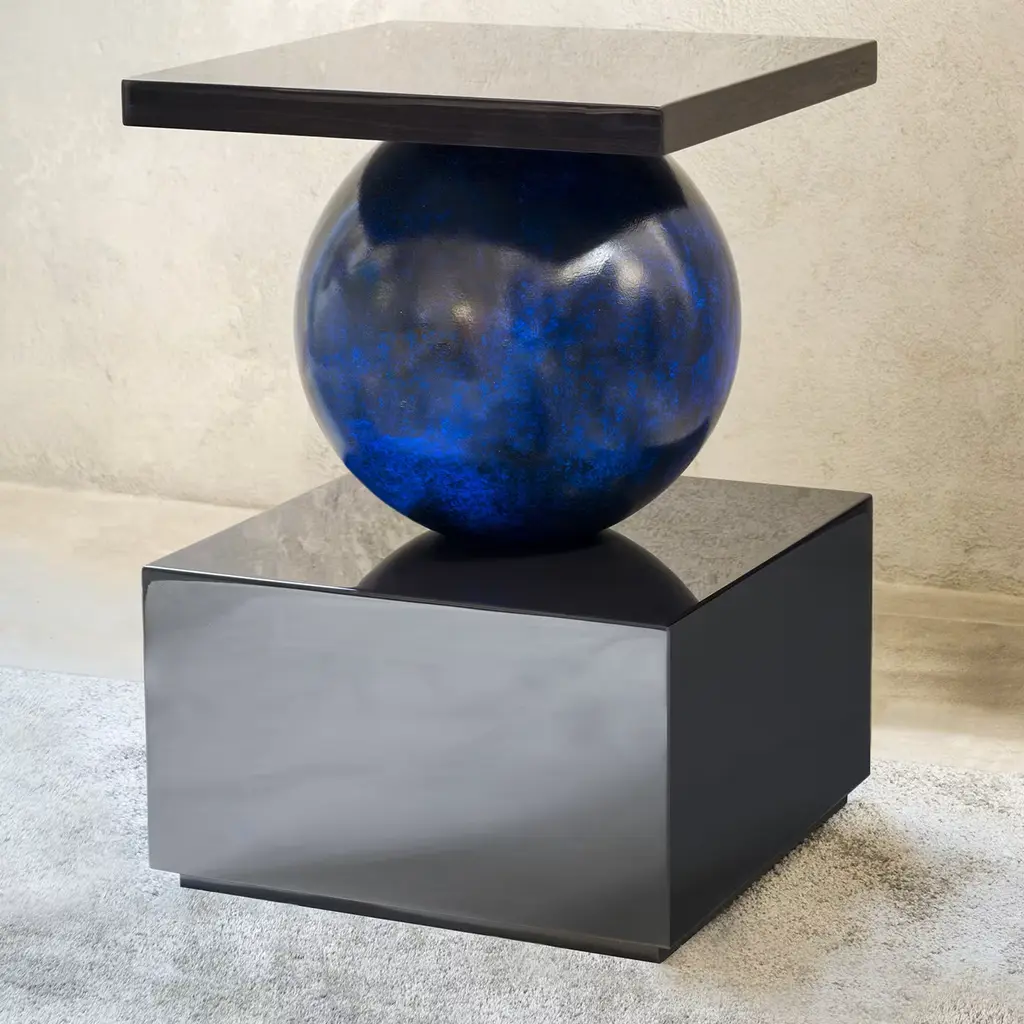 A classic piece with an avant-garde twist, this stunning side table is a functional work of art. The distinctive silhouette features a blue spherical body wedged between a square table top and a solid square base, both with a glossy, dark wooden finish. Sculptural allure and aesthetic balance come together in this functional work of art, making it the ideal place for showcasing tall-stemmed flowers or priceless vases. A focal point in an entryway, living room or study lounge, this handcrafted piece will infuse bold character into any minimalist interior.