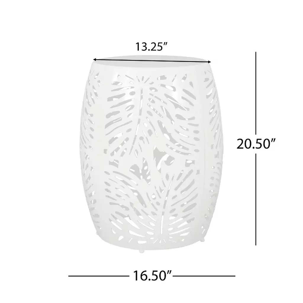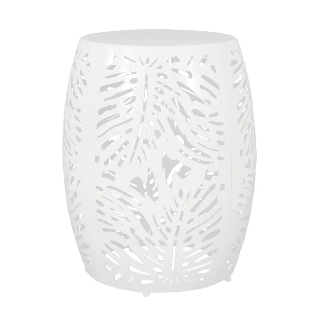 Okak Outdoor Side Table Iron Barrel-shaped End Table W Palm Leaf Pattern Cut Decorative Patio Tables For Porch Yard Balcony Deck Lawn Indoor, White