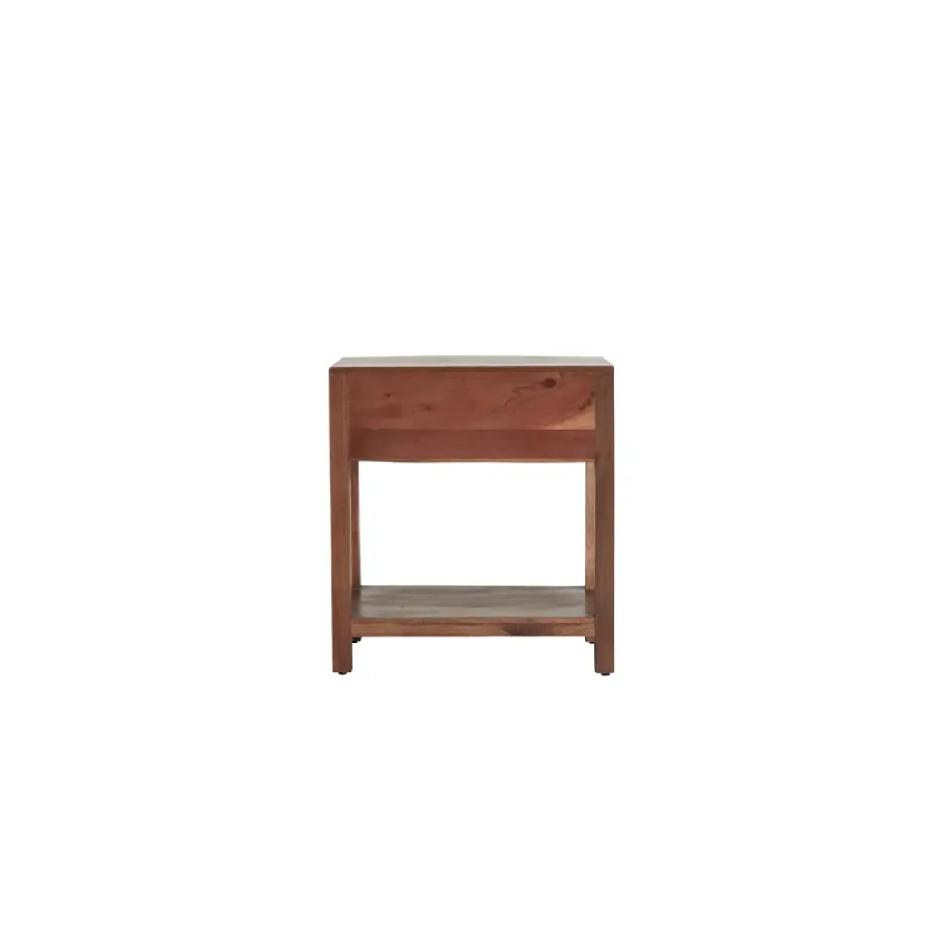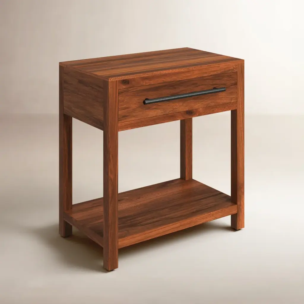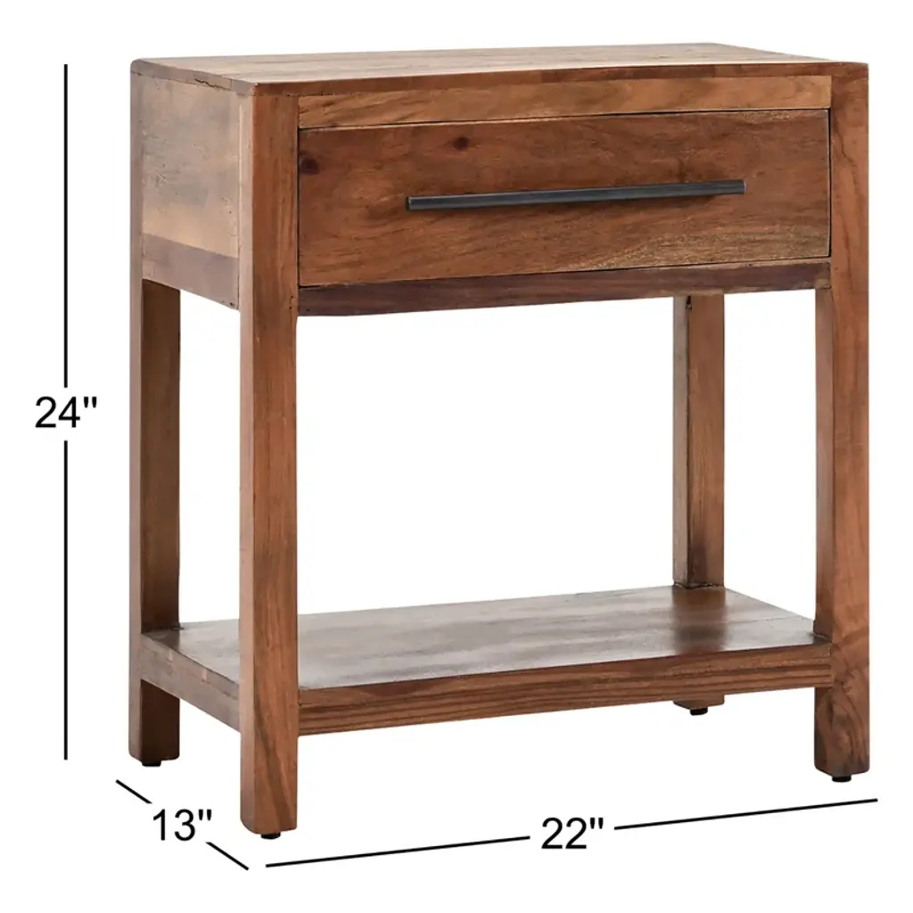 This modern, solid wood end table, inspired by vintage designs, effortlessly blends with contemporary decor. Featuring both a drawer and shelf, it offers a stylish solution for keeping your essentials close at hand.