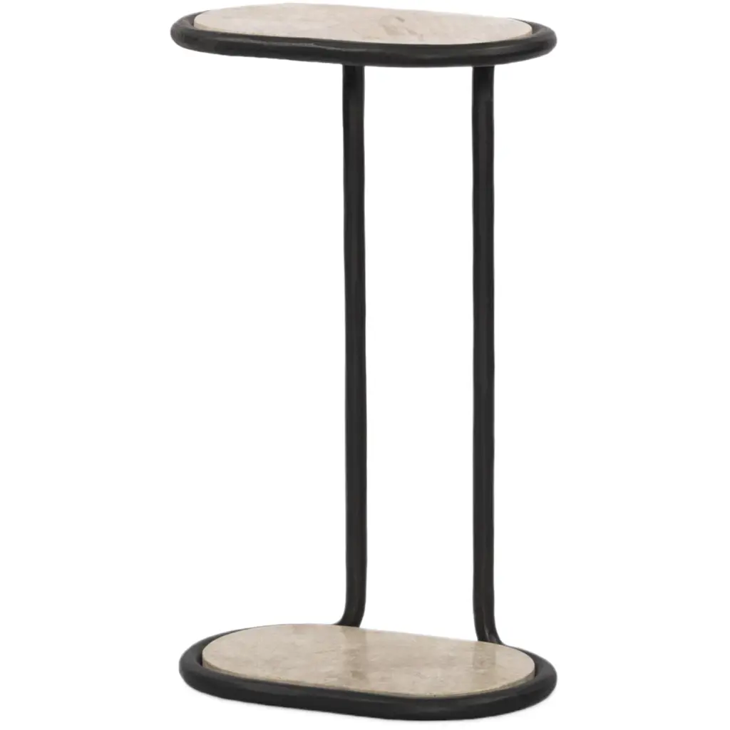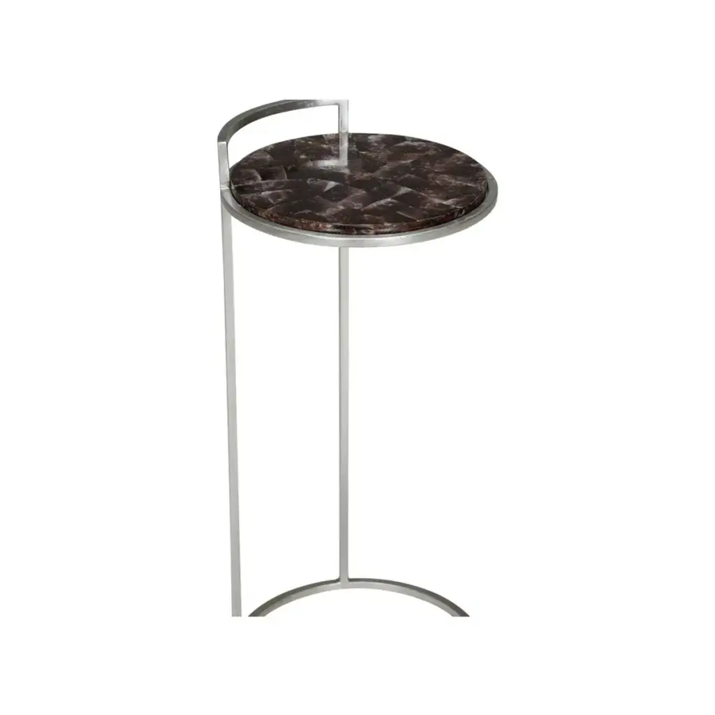 The Oleron Side Table boasts a smooth and polished surface, showcasing the natural veining and unique character of the violet oyster inlay. Resting on a gracefully curved base finished in antique silver, enhancing the overall aesthetic and appeal of the piece. Let its luxurious design and exquisite craftsmanship become the focal point of your space, adding a touch of sophistication and grandeur to your home.