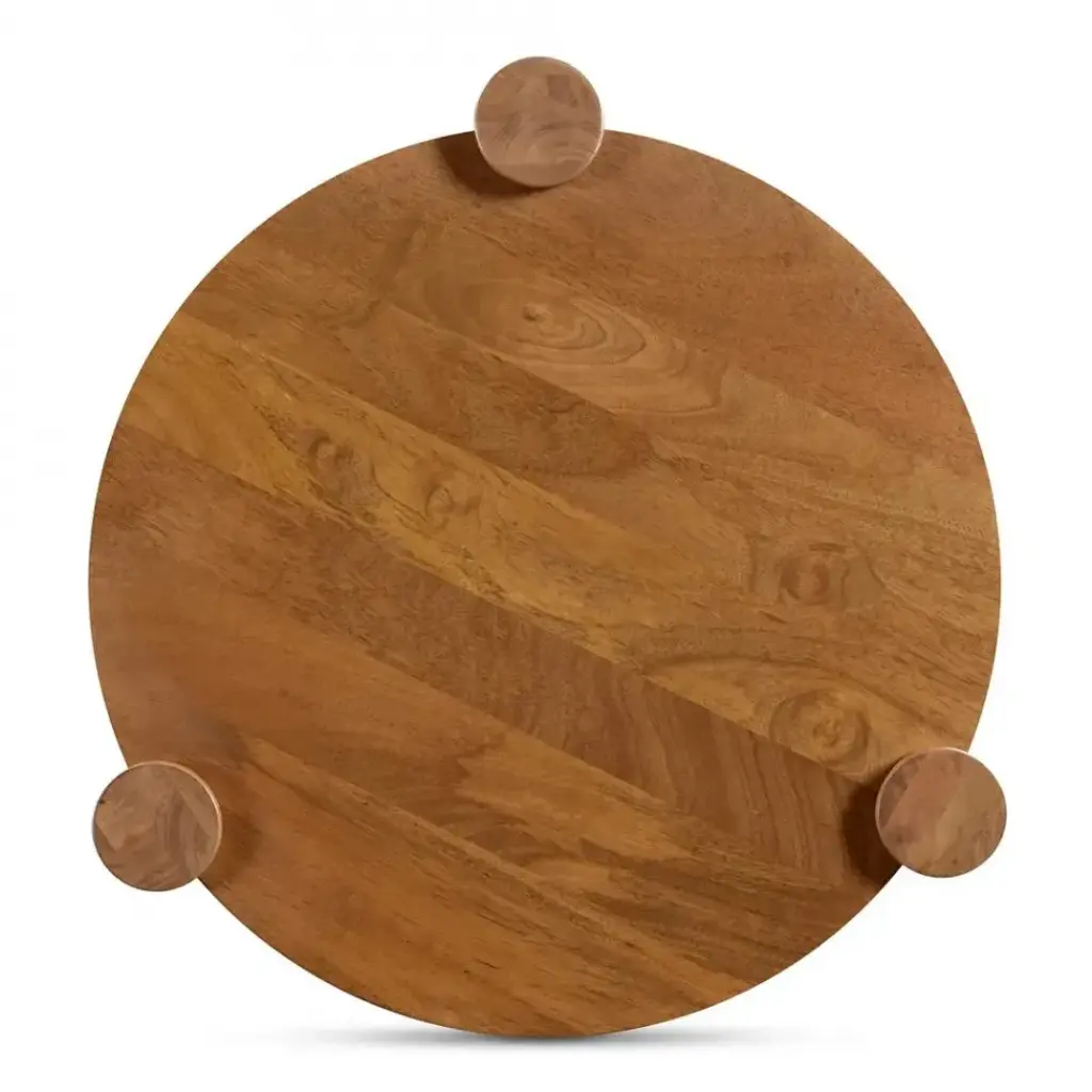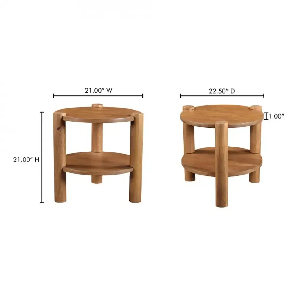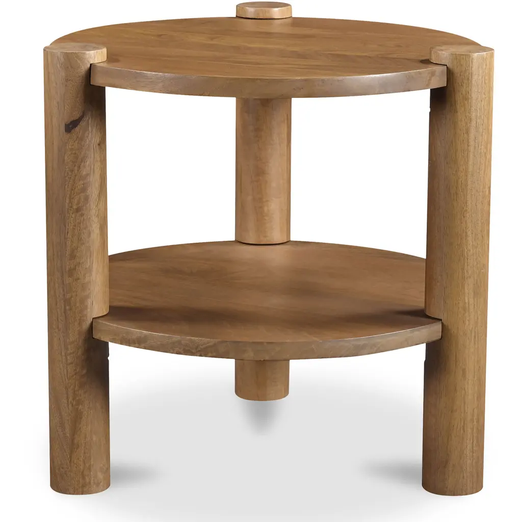 The Olsen accent table brings a vintage appeal and timeless charm, as its solid mango wood construction and warm brown finish add a rustic elegance. The cylindrical legs and meticulous joinery details are artfully incorporated alongside open storage. This piece effortlessly brings a sense of airiness and refreshing lightness to any space.