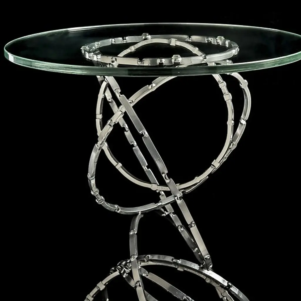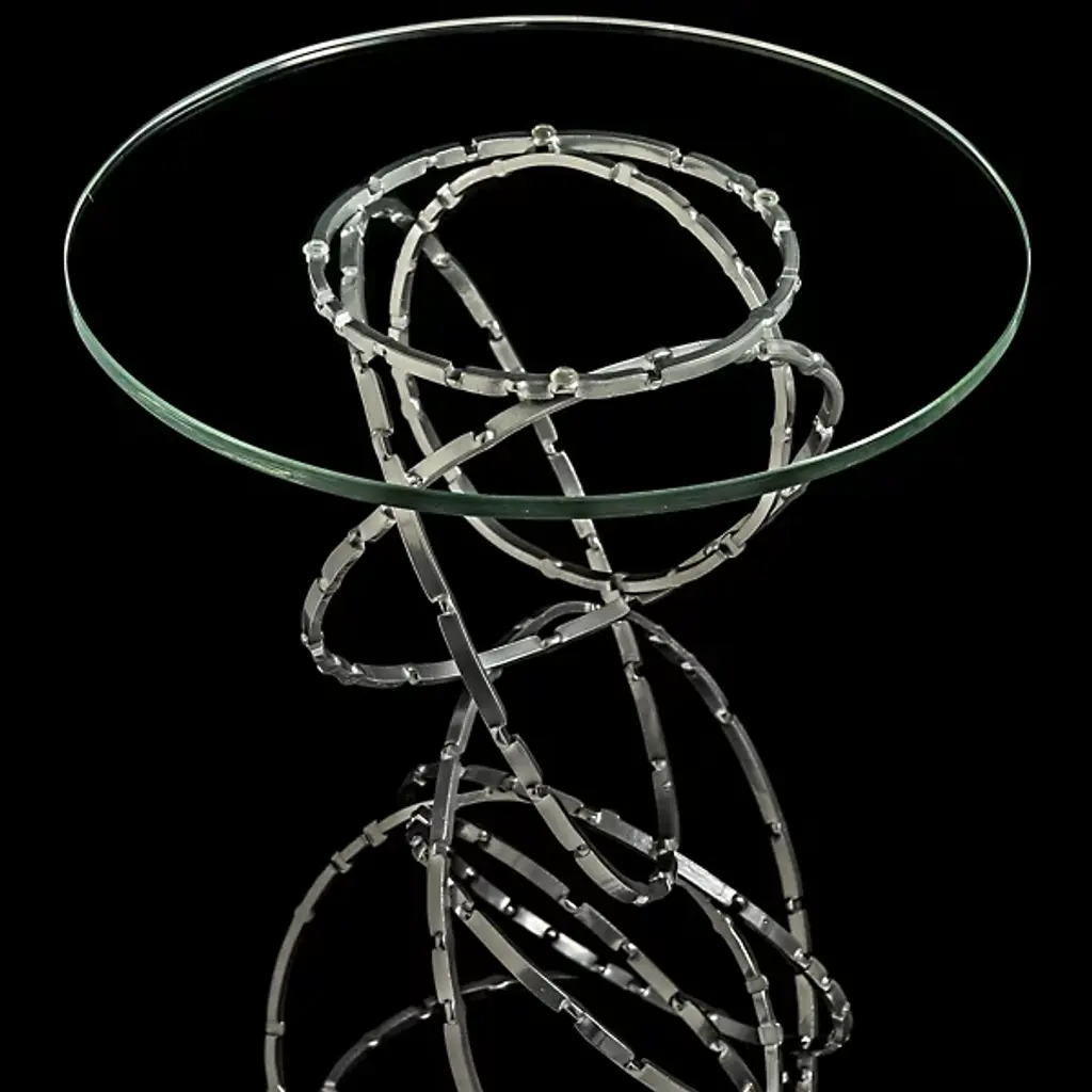 The ideal piece to bring a playful sense of movement to sophisticated interiors. The Olympus Glass Top Accent Table by Hubbardton Forge was designed by David Martin to evoke puzzle rings. Numerous hand-forged, hammered and stamped steel rings are arranged and welded together to create the dynamic base. In a living room or bedroom, this terrific tangle of metal rings is visible from all directions thanks to the side table’s tempered glass top.