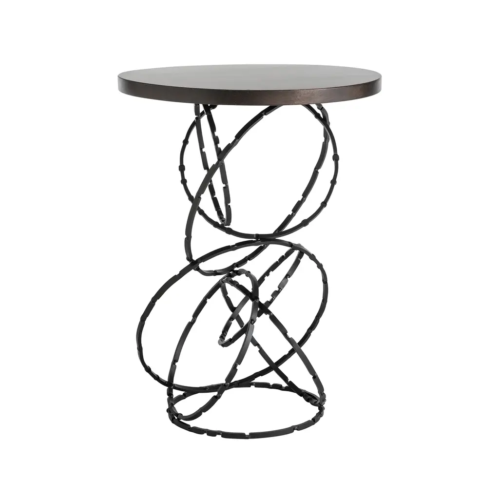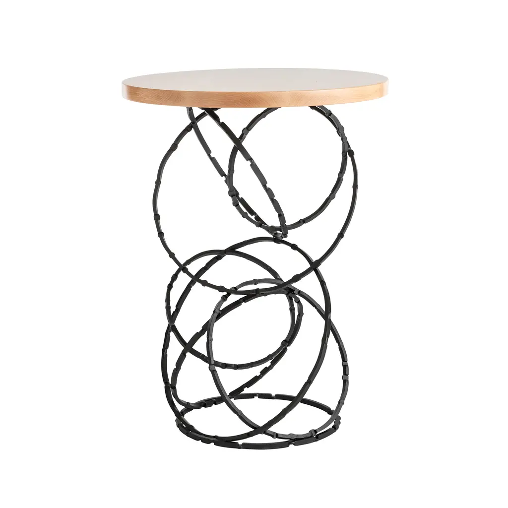 With a unique take on a pedestal-style base, the Olympus Wood Top Accent Table by Hubbardton Forge features a design that cascades in a blend of round rings and square stamped forms creating a puzzle of organic and geometric shapes. The solid Vermont maple wood top adds an extra organic touch that contrasts to perfection with the texture created in the steel base form. The finished product is an architecturally inspired table that is sure to be a focal point in any room of your modern home. Shown in black finish with natural maple wood top accent