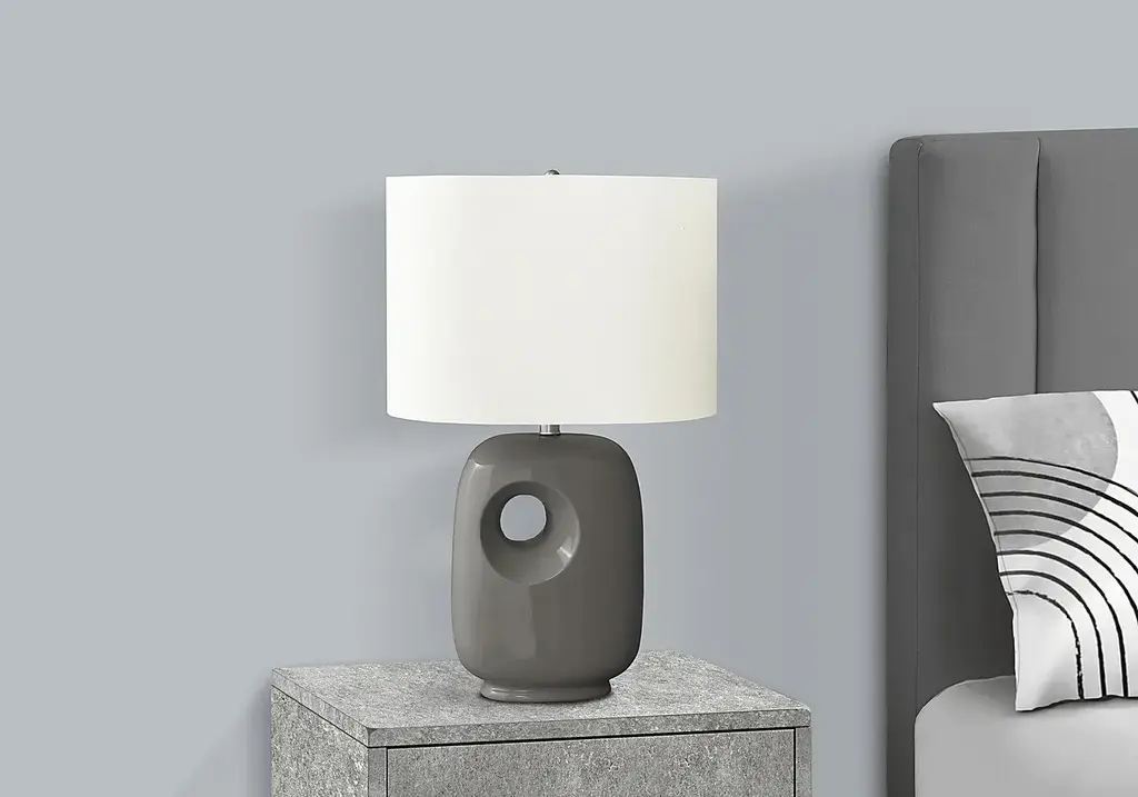 Illuminate your space with the modern and trendy Omaha Reef Gray Lamp with a sleek dark gray ceramic base and topped with a linen-blend, ivory fabric shade. The architectural and contemporary cut-out design on this lighting piece will easily brighten and elevate your home decor whether placed on an end or side table, or on a nightstand as a chic decorative and functional accent. Partial assembly may be required.