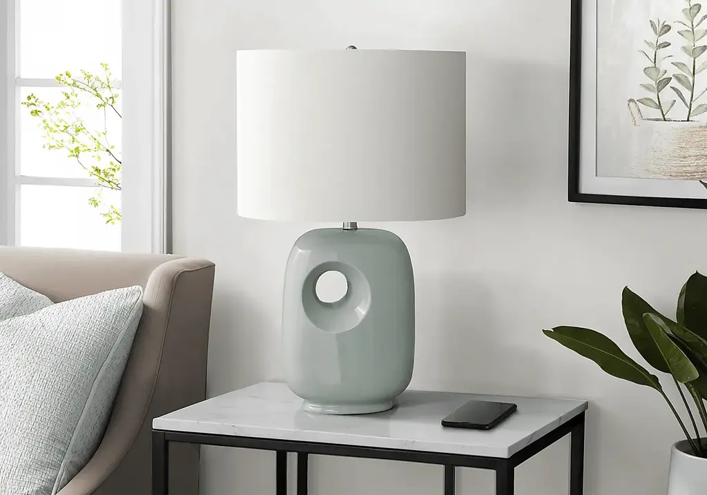 Illuminate your space with the modern and trendy Omaha Reef Green Lamp with a sleek green ceramic base and topped with a linen-blend, ivory fabric shade. The architectural and contemporary cut-out design on this lighting piece will easily brighten and elevate your home decor whether placed on an end or side table, or on a nightstand as a chic decorative and functional accent. Partial assembly may be required.