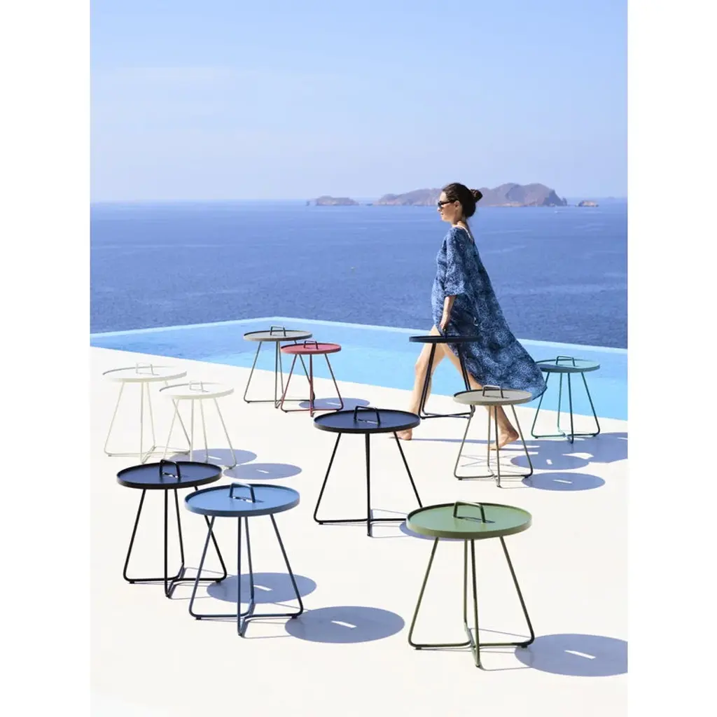 Cane-line’s On-the-move is a cheerful and multifunctional side table that is suitable for both indoor and outdoor use. Made of durable and lightweight aluminum and equipped with a handle, On-the-move is easy to move from one place to another. The detachable tabletop also functions as a tray that can be lifted off and used separately. On-the-move is a perfect side table for terraces, balconies or gardens, and it also makes a convenient, modern sofa table in the living room. The table was designed by the Danish design office Stand+Hvass. On-the-move can be used outdoors throughout the year, but it is recommended to store it indoors during the winter season.