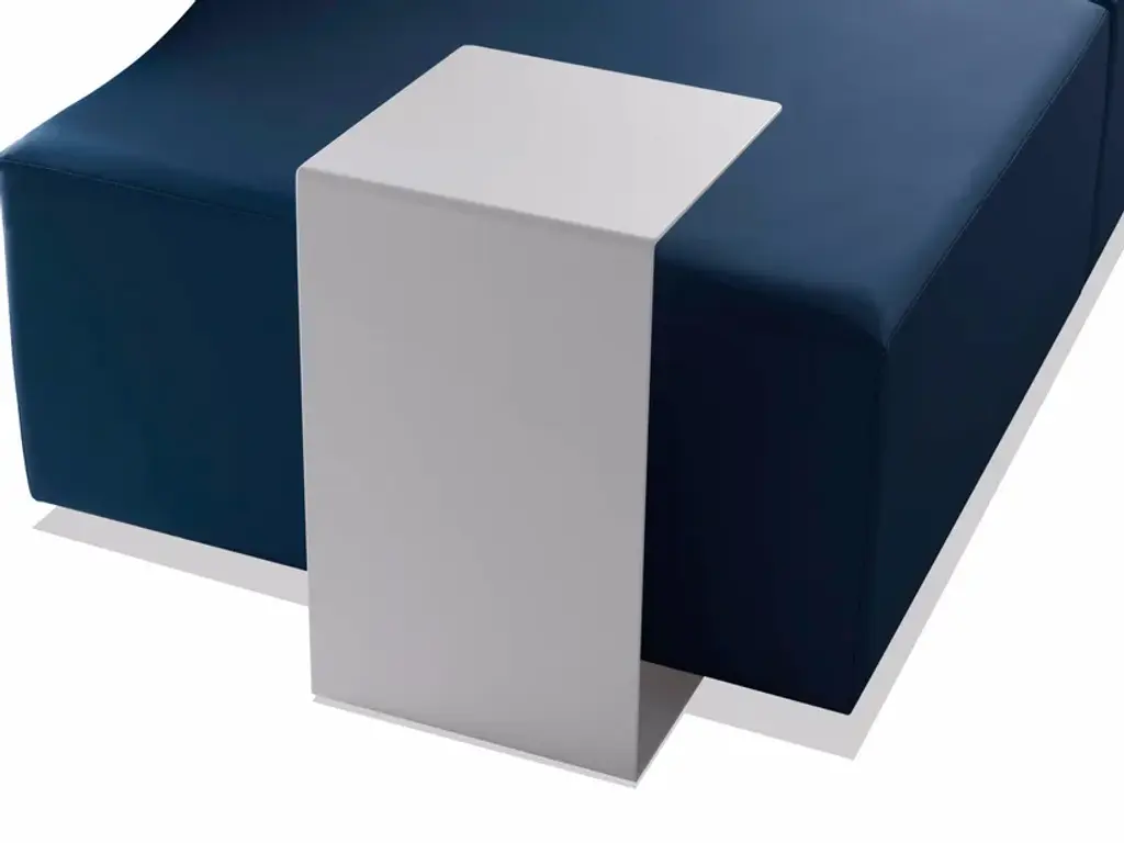 Service table in folded sheet metal, glossy lacquered in white or black from the ONDA collection.Harmony of fluid and sinuous curves. ONDA is a collection of three different padded, modular seats which can be grouped together in various ways. It imprints its environment with a touch of vivacity and freshness with a strong visual impact. To complement and make the collection more expressive and functional, there is a series of coffee tables in wood and metal.Pouf with frame made of wood particle board. Unpholstery with nondeformable polyurethane foam with different densities. Covering with fabric, eco-leather or c.o.m. Feet in polypropylene. The tables/containers are made of mulptply veneered beechwood natural or stained according to sample book. The service table are made of folded sheet polished in white or black colors. The elements can be combined together with a hidden joint.
