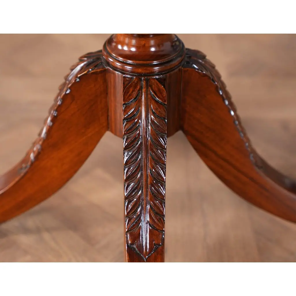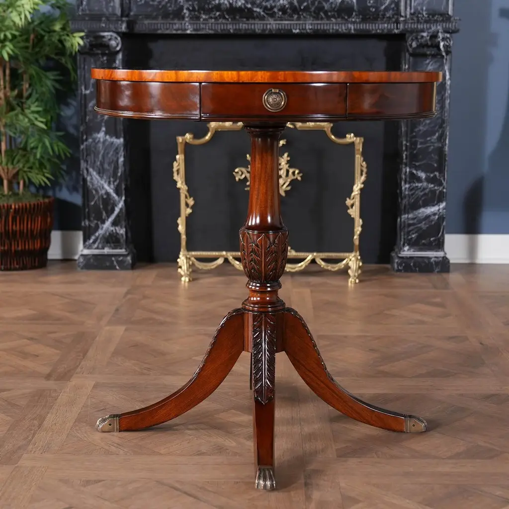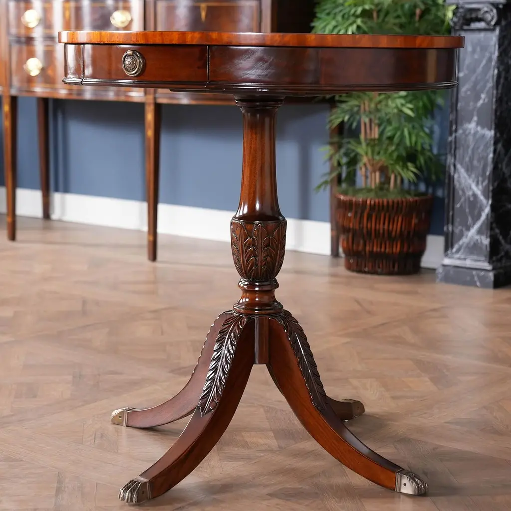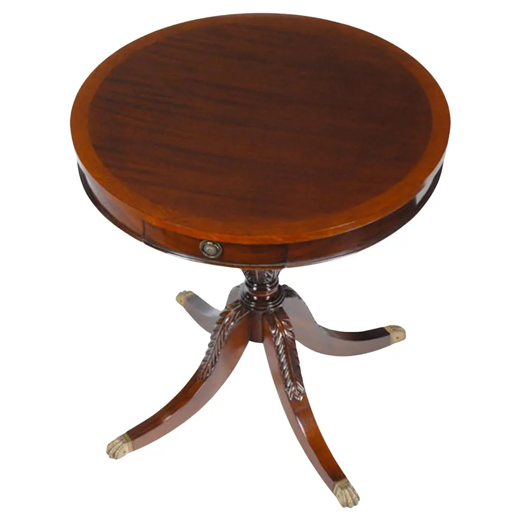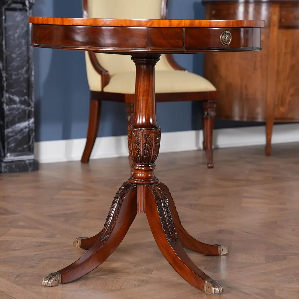 The elegant and refined One Drawer Drum Table from Niagara Furniture boasts great hardware, as well as a satinwood banded edge. The drum portion of the table is fastened to a solid mahogany, acanthus and feather carved base with brass capped feet. Great for use as an end table but also suited for display in the center of a front entry way, under a window, etc.Measures 28.5″w 32″h