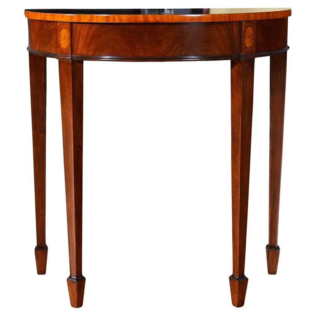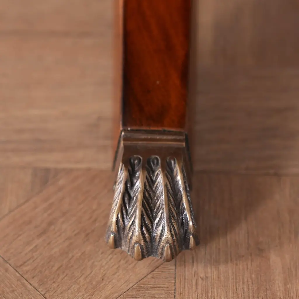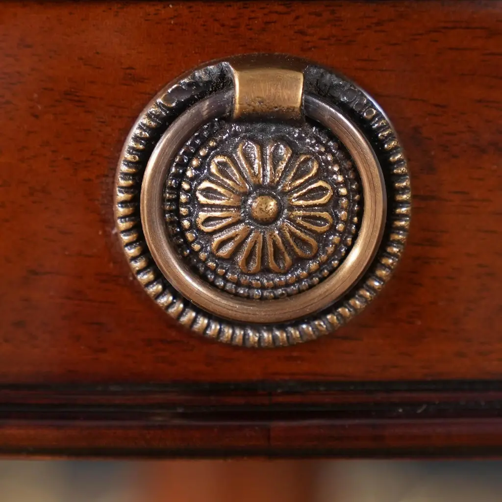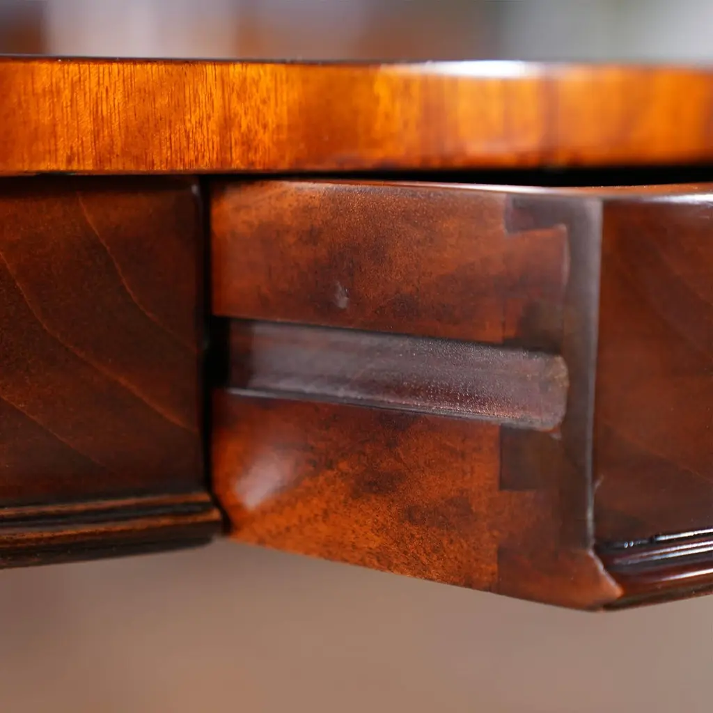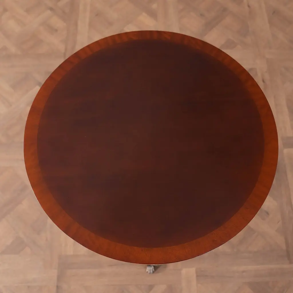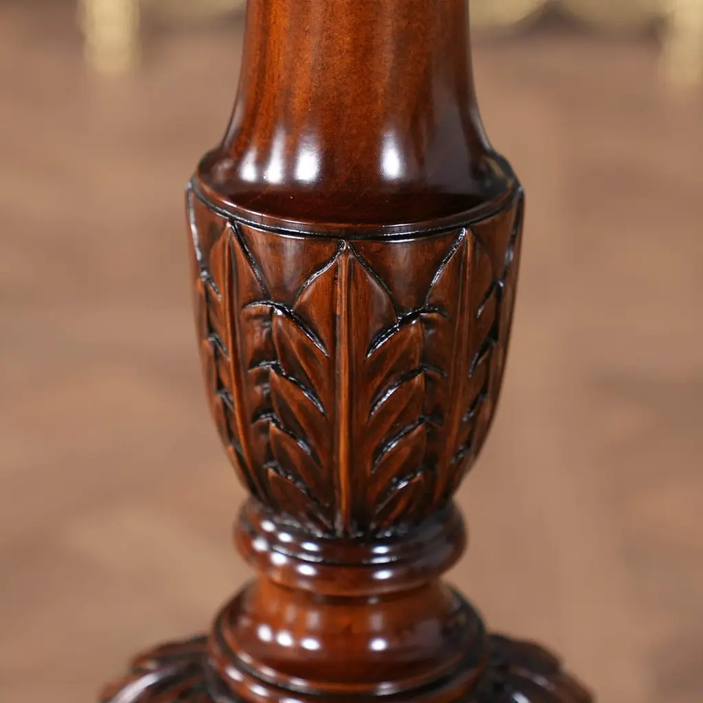 The elegant and refined One Drawer Drum Table from Niagara Furniture boasts great hardware, as well as a satinwood banded edge. The drum portion of the table is fastened to a solid mahogany, acanthus and feather carved base with brass capped feet. Great for use as an end table but also suited for display in the center of a front entry way, under a window, etc.Measures 28.5″w 32″h