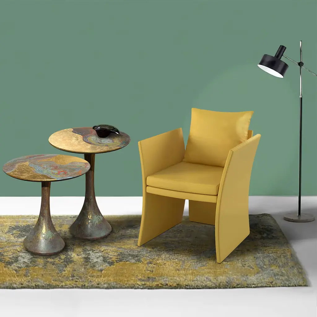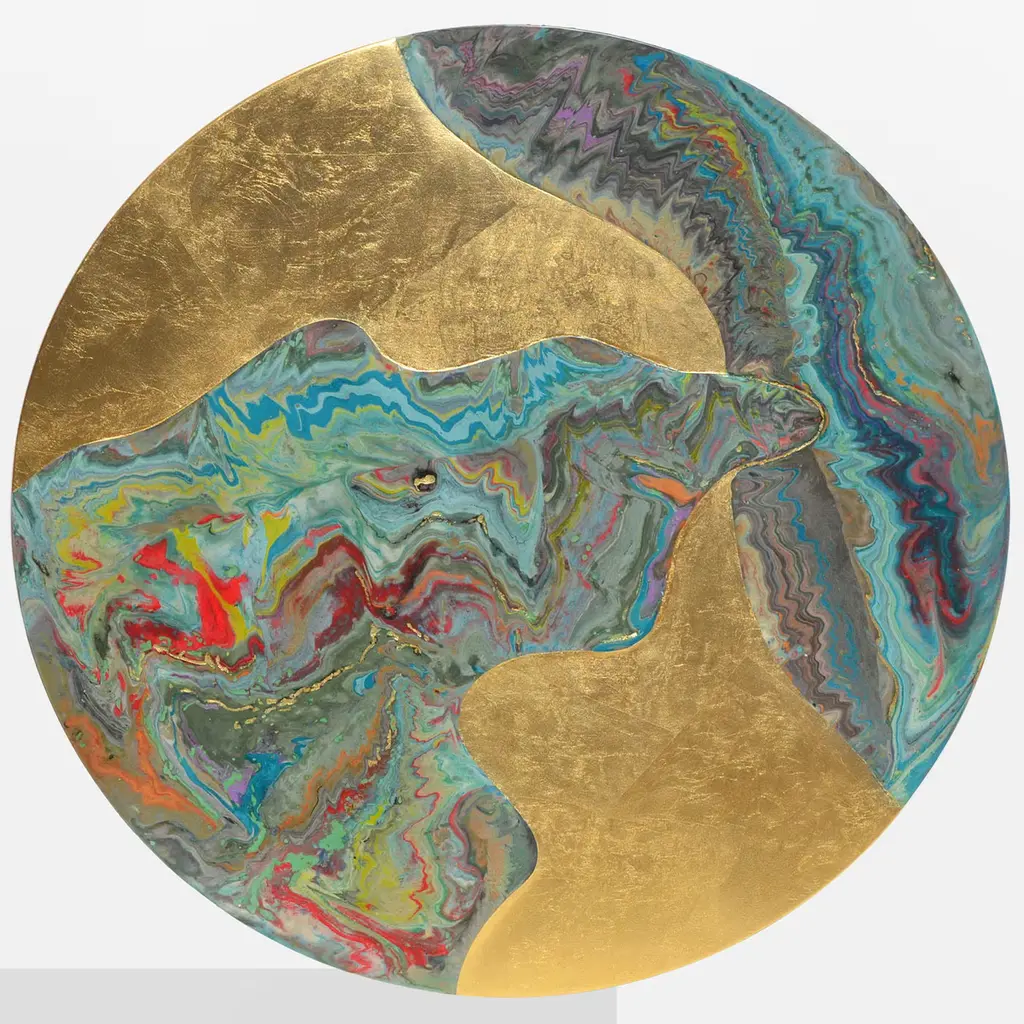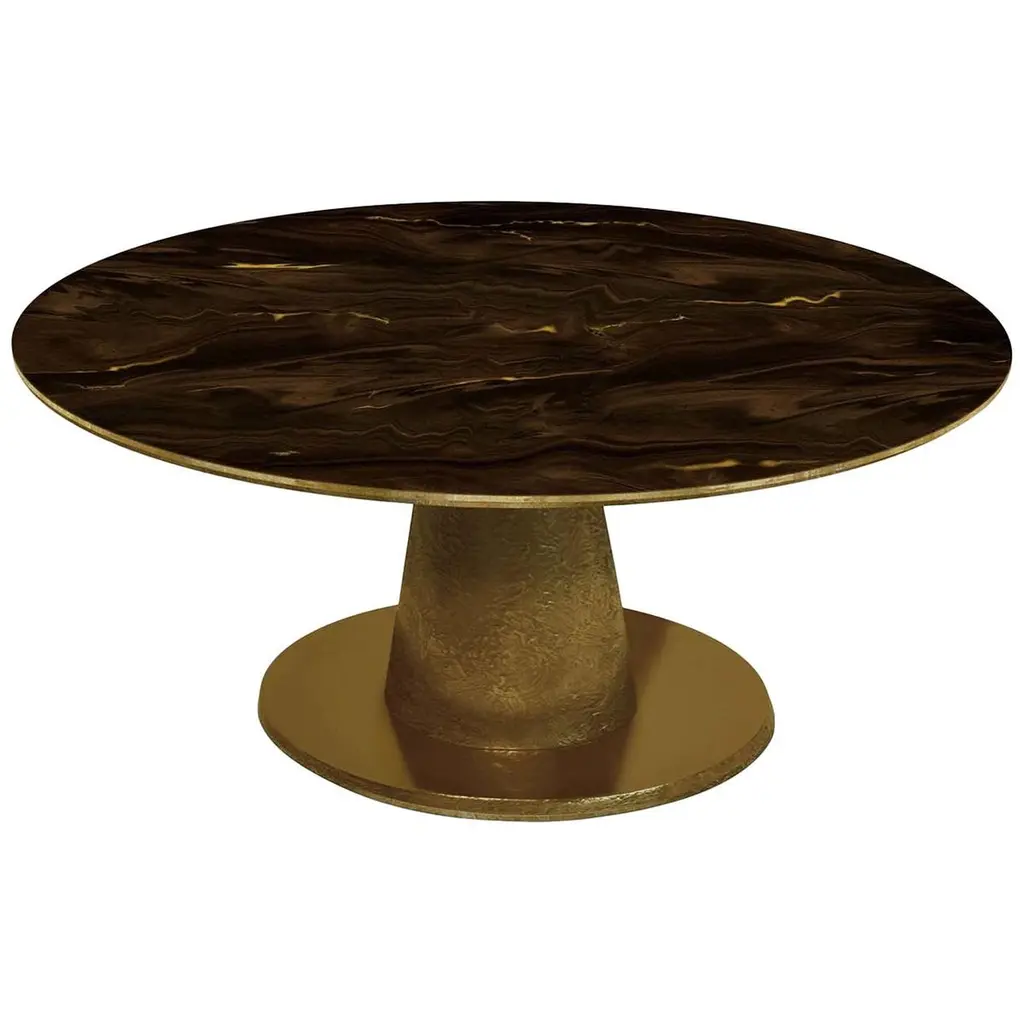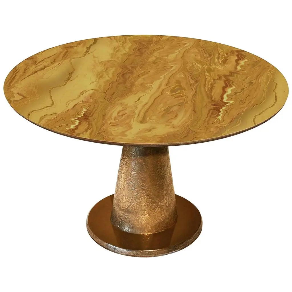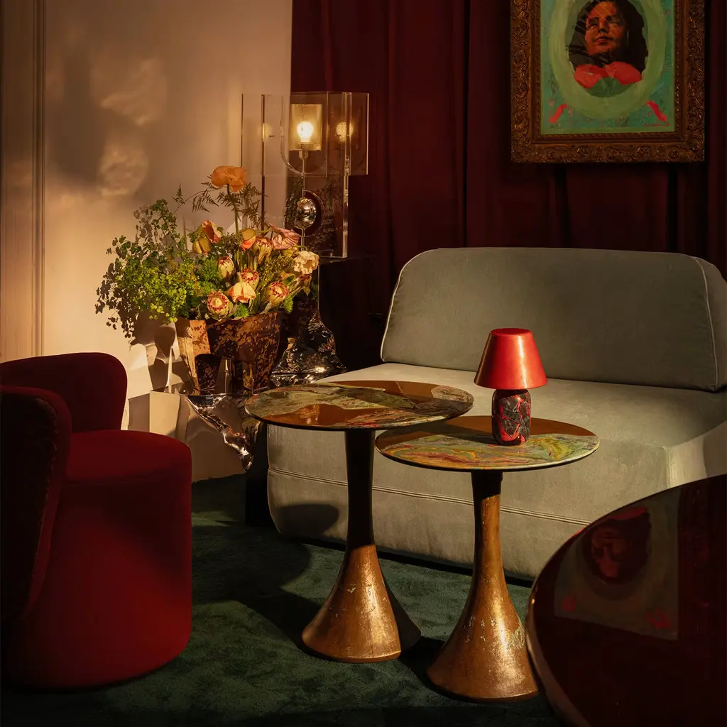Polychrome oxides and shimmering gold leaf make up the intriguing and unrepeatable manual decoration characterizing this one-off side table. Fitted to a Fenix disk, the top seals the harmonious silhouette whose metal base flaunts a dynamic trumpet shape decorated with ceramic. Brimming with artistic flair, the piece also comes in a taller version available in the Artemest catalog.