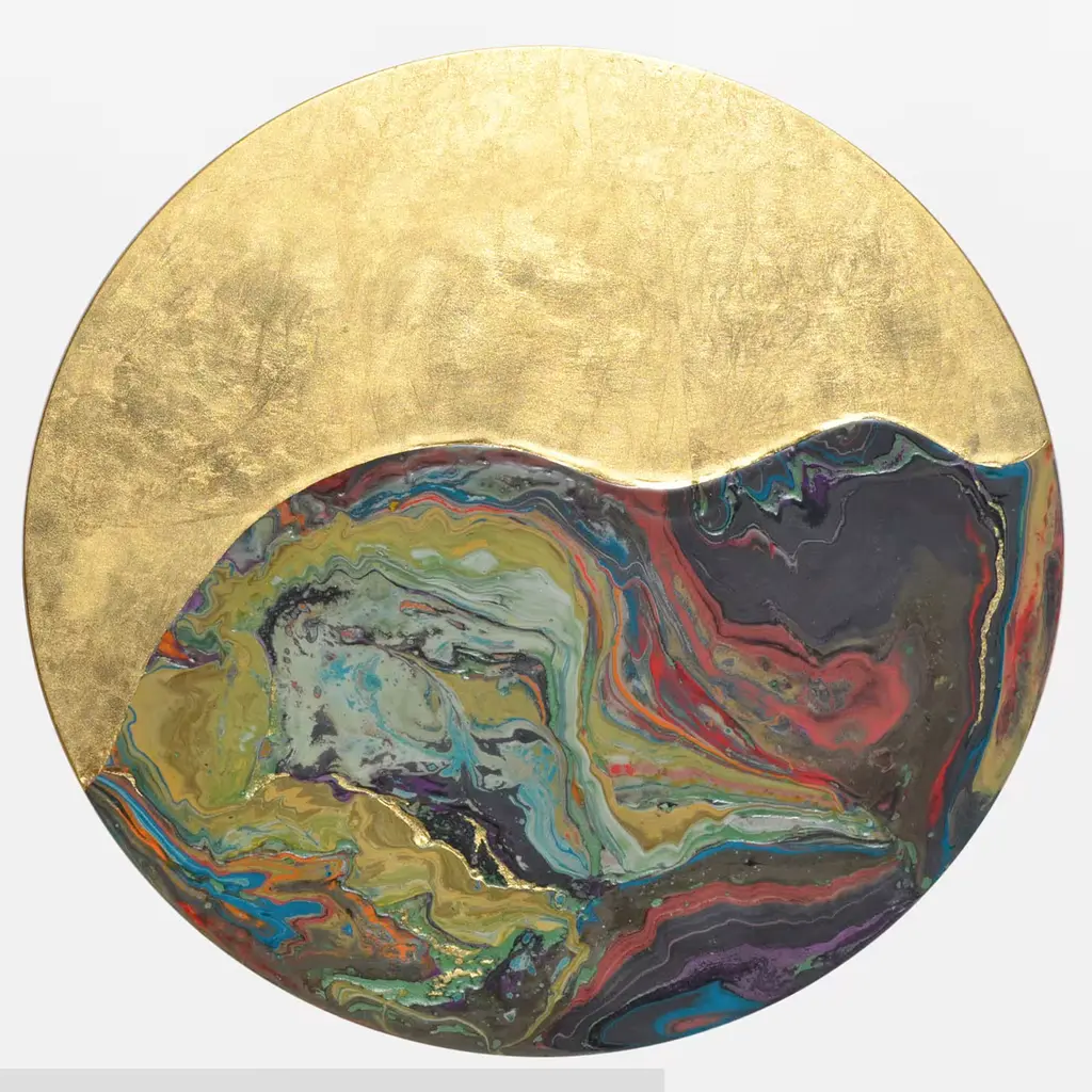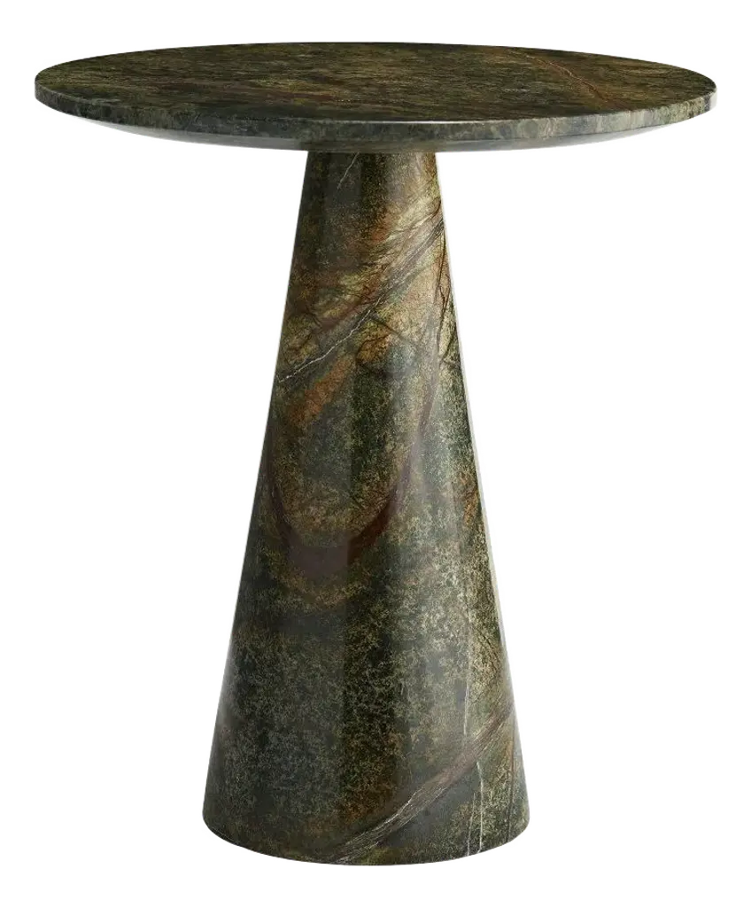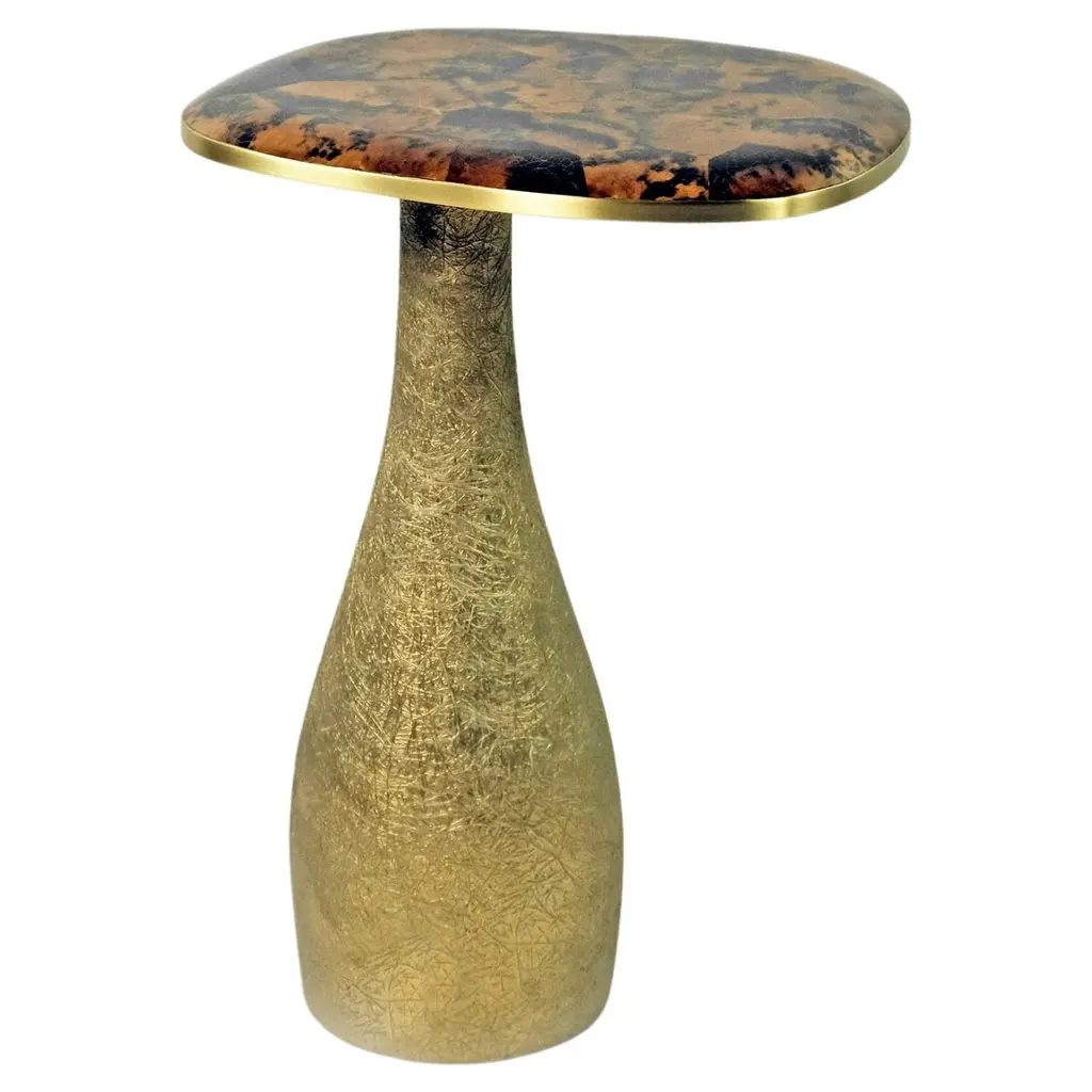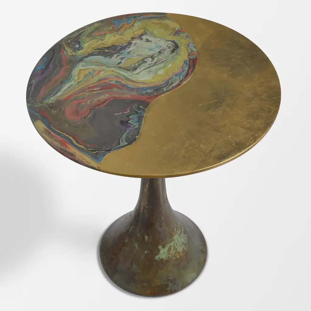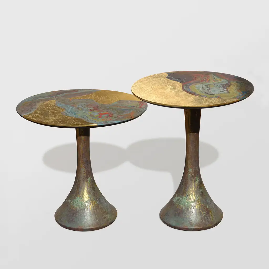 Marked by harmonious curves, this round side table makes for a precious addition to classic or industrial-style interiors, alike. A stunning sheen is owed to the deft application of gold leaf that, interacting with a colorful oxidized look, lends the piece its artistic allure. Carefully decorated by hand and supported by a Fenix disk, the top rests of a dynamic trumpet-shaped metal base decorated with ceramic.
