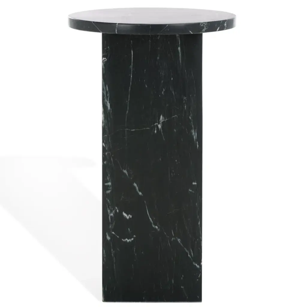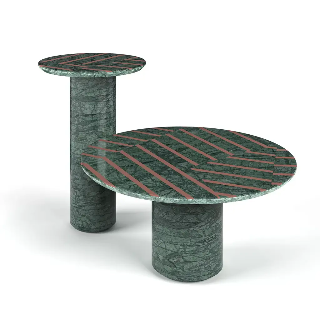 Unpredictable traceries drawn by nature meet geometric dynamism in this opulent side table from the Optic series. Once smoothed and polished, rings of prized Green Guatemala marble are stacked to form the pillar supporting a matching top, where zig-zagged earth-brown resin cement inlays trace a vibrant geometric pattern. Different versions are available in the Artemest catalog.