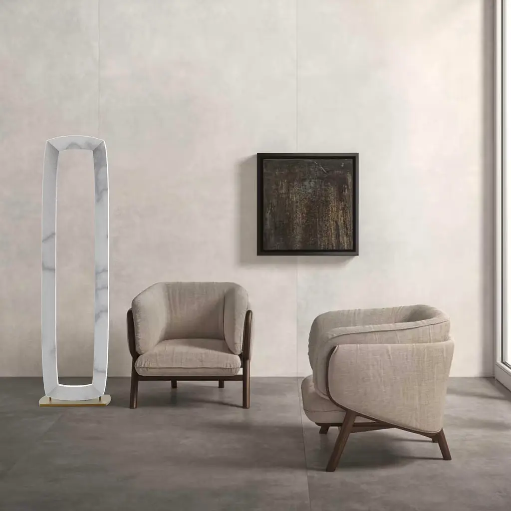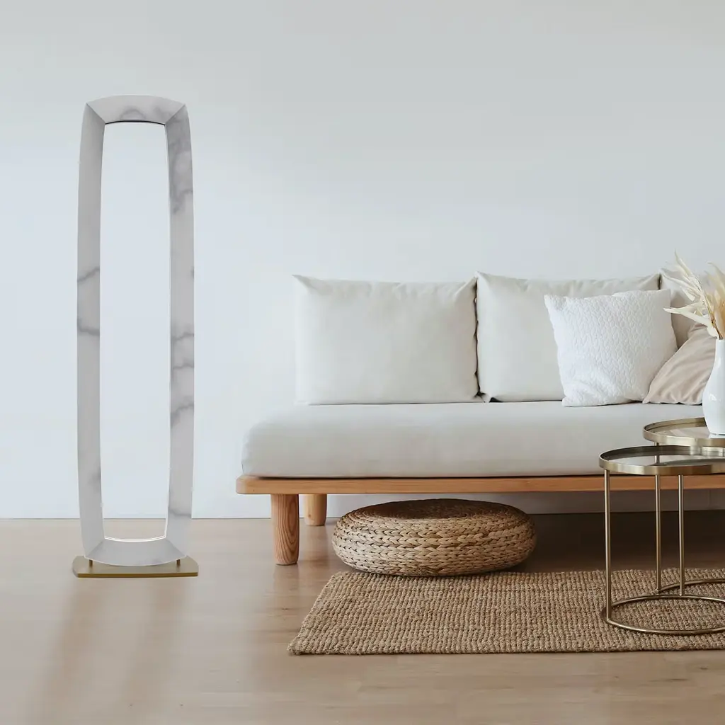 The OR5 Eos floor lamp exemplifies the intersection of artistry and functionality. Crafted from solid Carrara white marble, each lamp is meticulously shaped using advanced CNC techniques, ensuring precision and elegance in every curve. The surface is expertly finished with a hand-polished sheen, enhancing the natural beauty of the marble. This striking floor lamp features a brushed gold base that complements the luminous strip LED lighting, which is included and conveniently mounted along the cable. The design not only serves as a source of gentle illumination but also acts as a statement piece, suitable for various interior aesthetics from modern to classic. Ideal for creating ambiance in living spaces, this lamp brings an element of sophistication and warmth to any room.