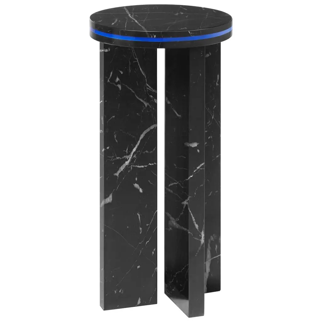 Our striking Oracle side table is a geometric feast for the eyes. The round, glass surface sits on a gold-toned, stainless-steel disk. The base is made of sleek black marble. Add this eclectic piece of accent furniture to your interior for a touch of character and class. The juxtaposition between sharp angles and soft curves is ideal for any contemporary space. Dimensions: 16.0''W x 16.0''D x 23.0''H Finish: Metal - Stainless Steel - Brushed Nickel-Plated Stainless Steel, Glass - Clear, Stone - Carrara (Marble) - Carrara Marble Black Tear Sheet