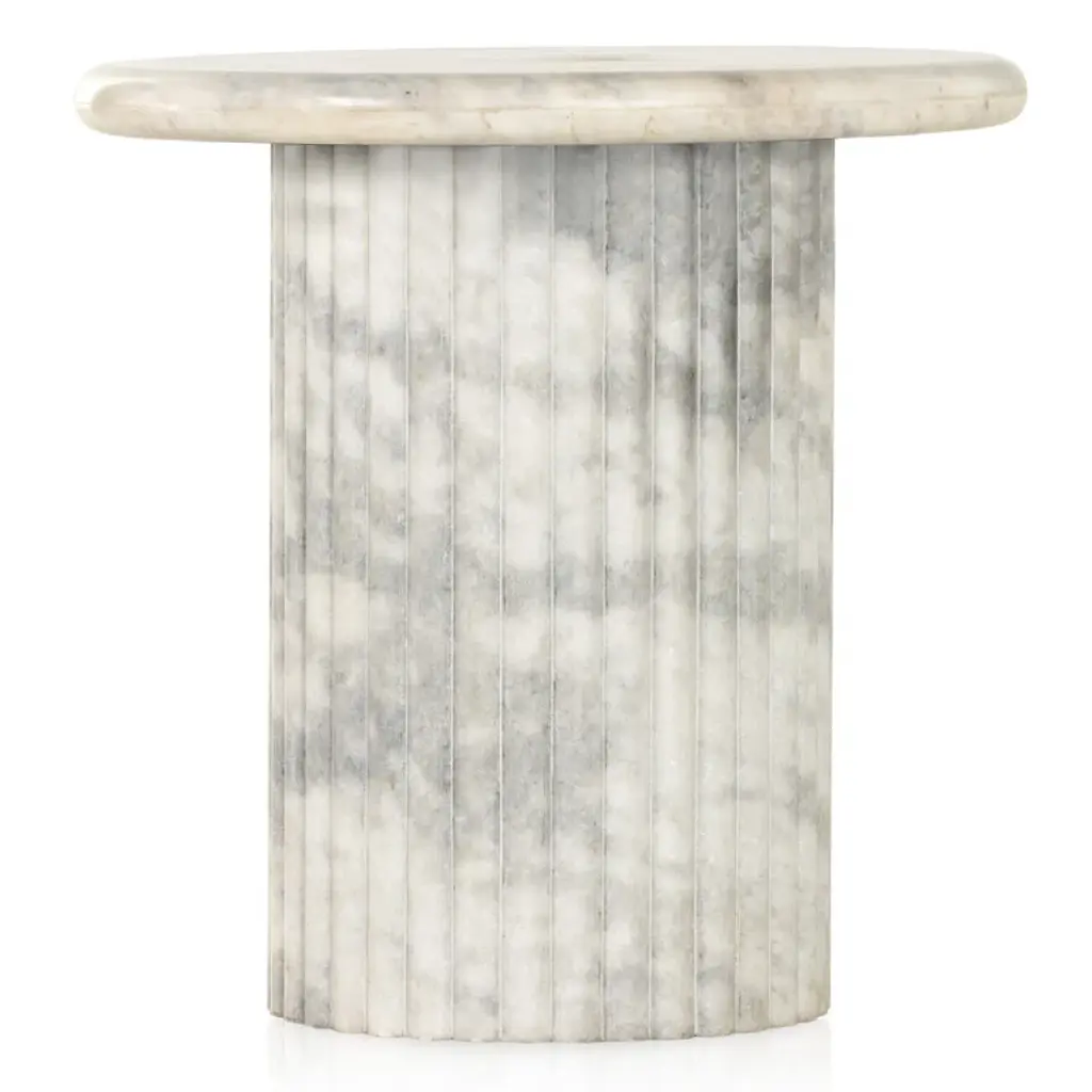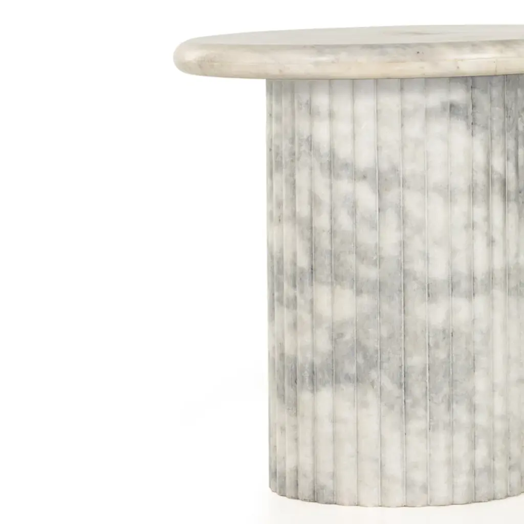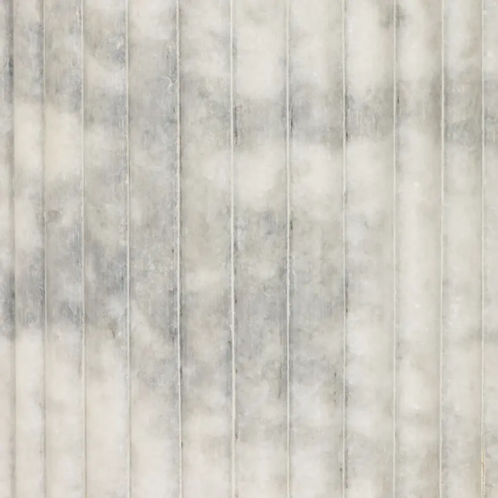 Inspired by Italian design, a swirling marble base is scalloped for a linear look with a heavy texture. Topped with polished white marble.