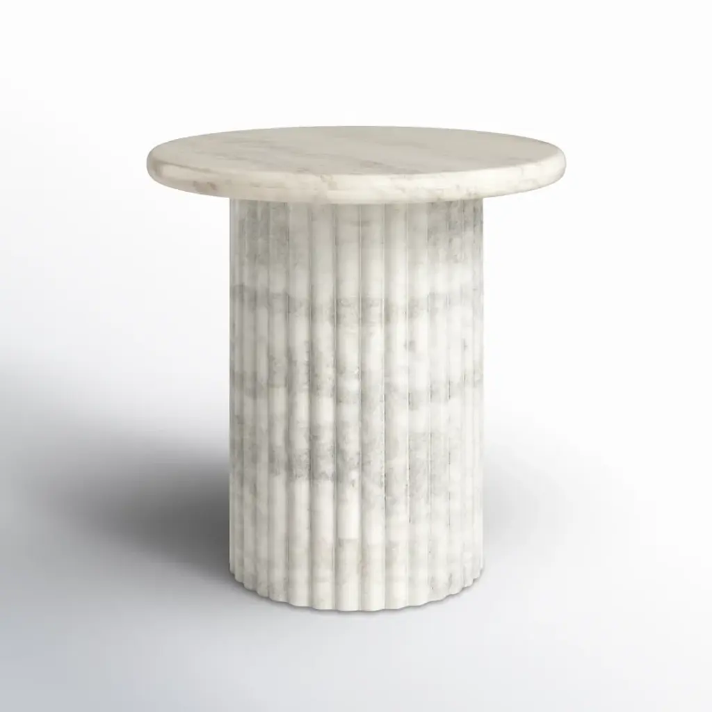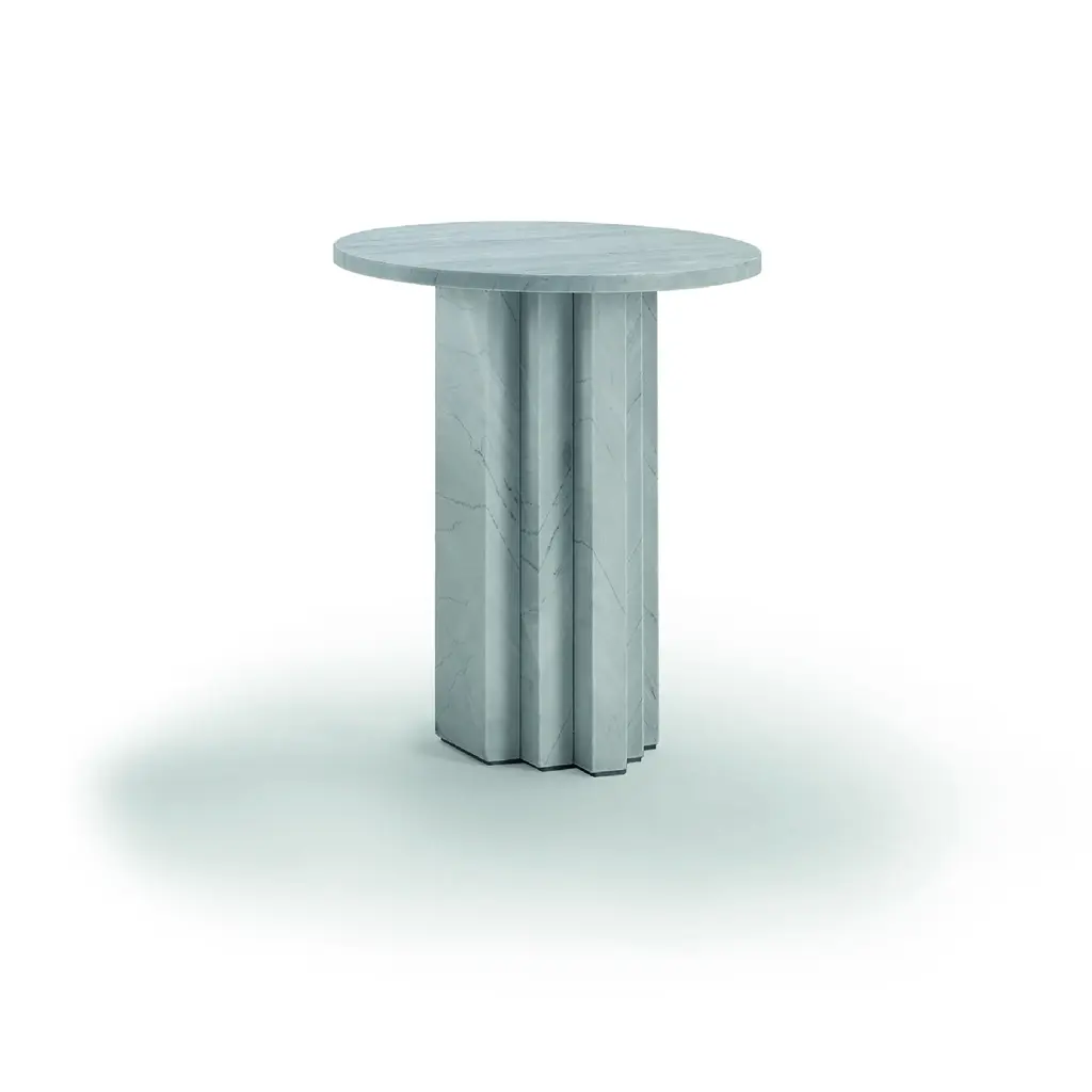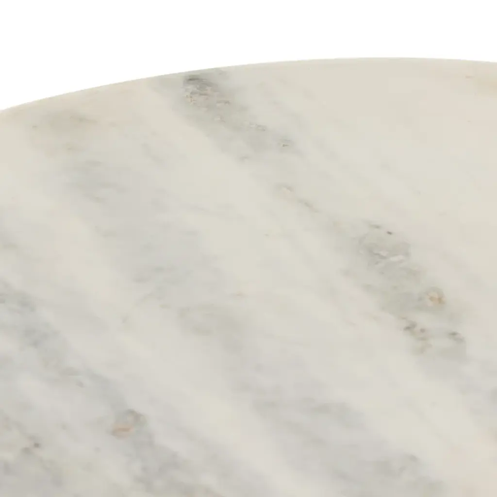 Inspired by Italian design, a swirling marble base is scalloped for a linear look with a heavy texture. Topped with polished white marble.