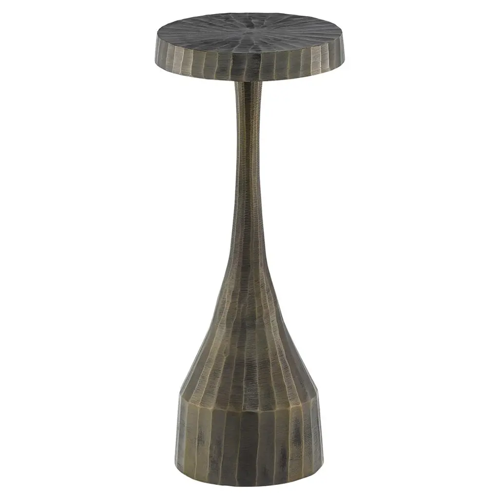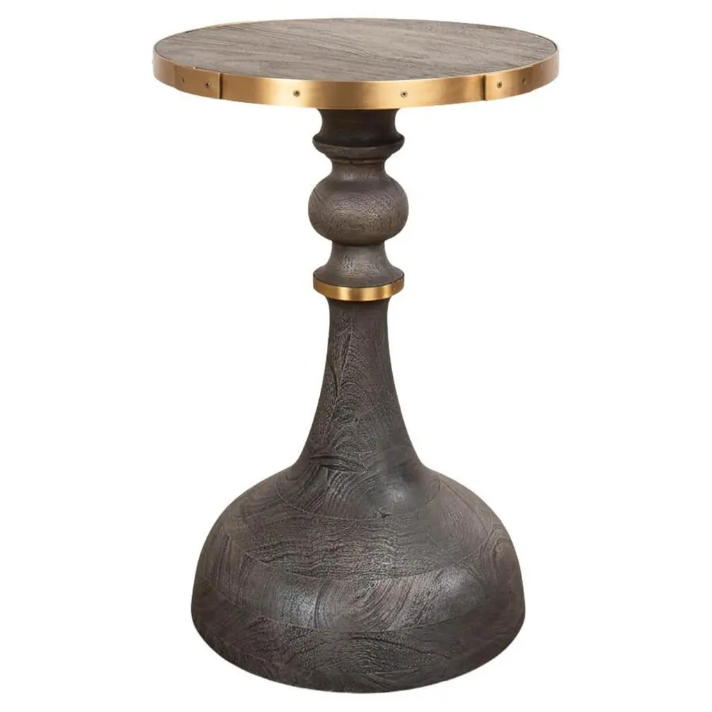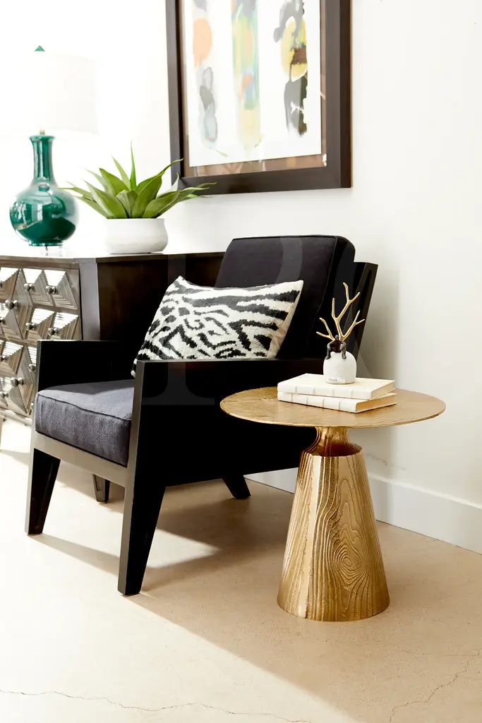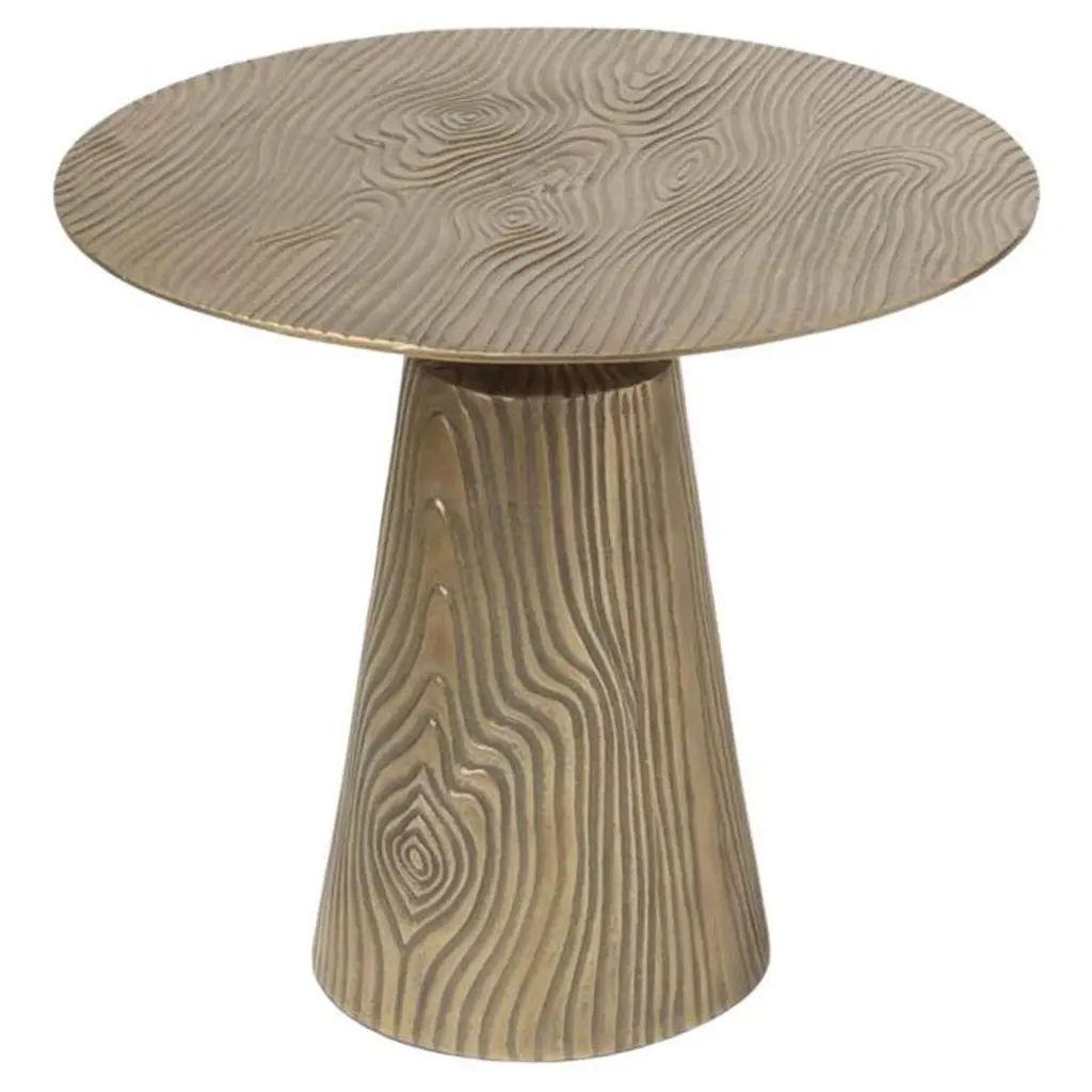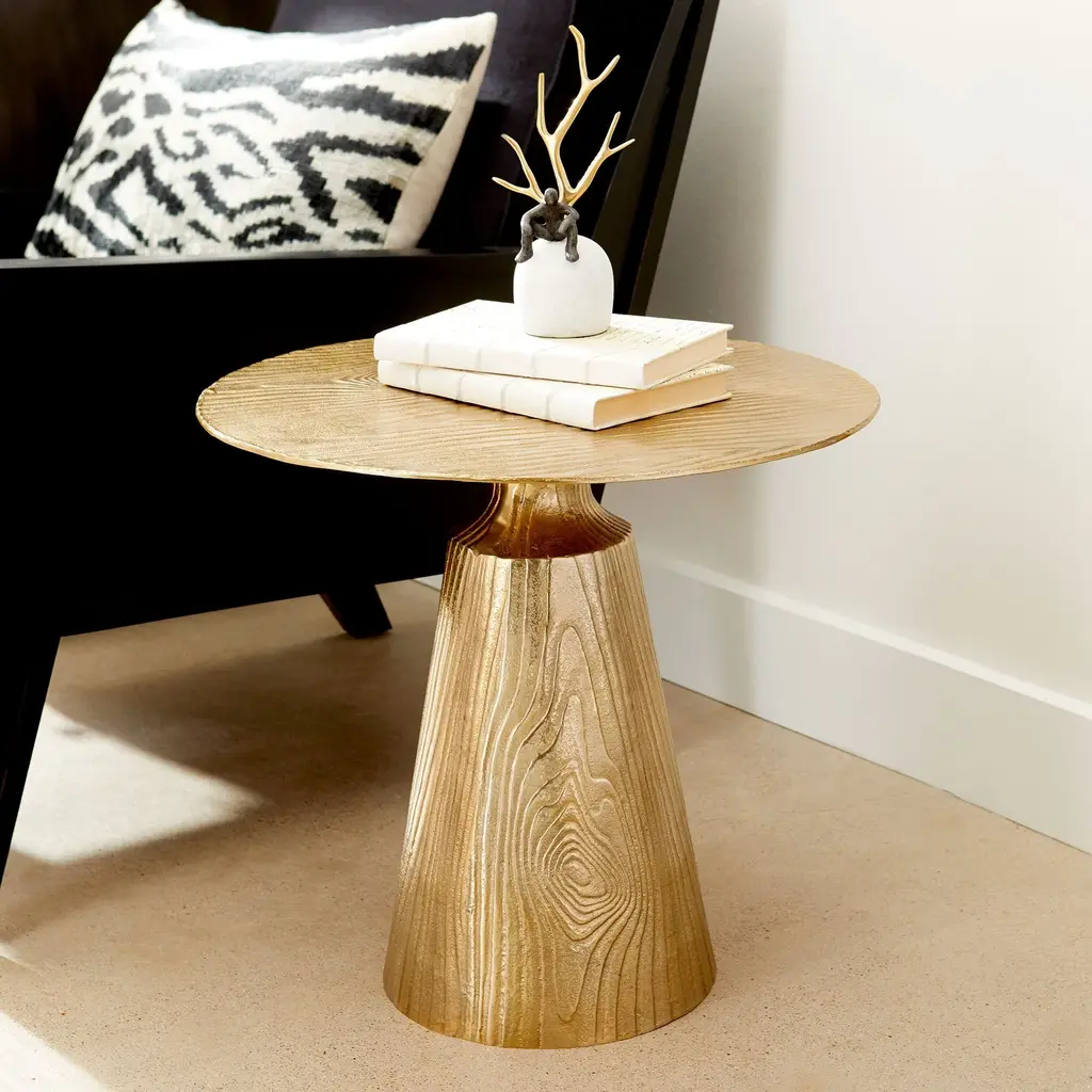 Whether placed next to a sofa or added to a seating group, the Oregonia end table is a handy touch for rounding out any living ensemble in style. The modish-organic design is a glamorous option in any space, it`s crafted from a circular aluminum, with a faux wood grain surface founded on a sweepingly curved pedestal base for a touch of transitional earthy-inspired glamour. A gleaming brass finish rounds this piece out with an additional pop of glam.