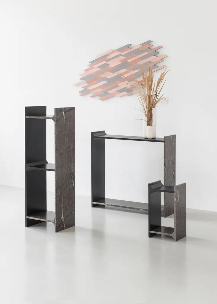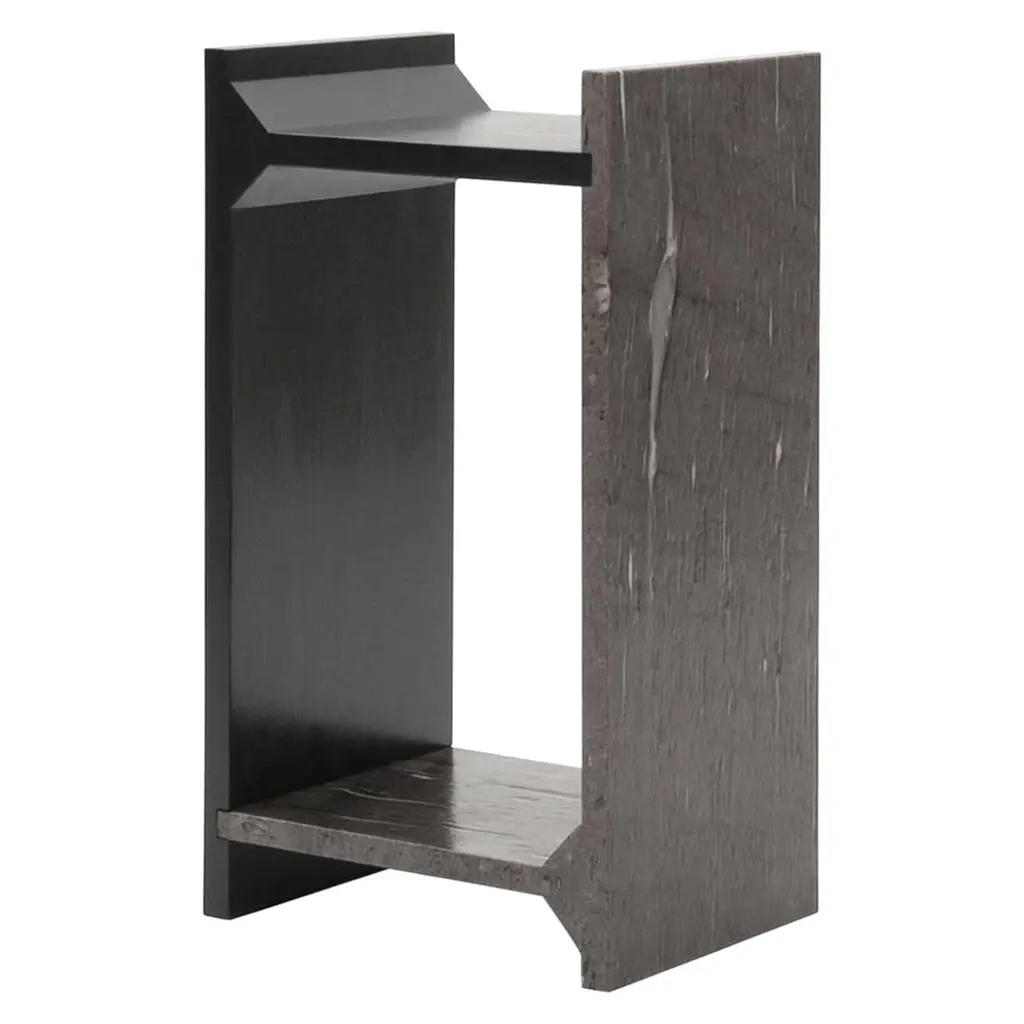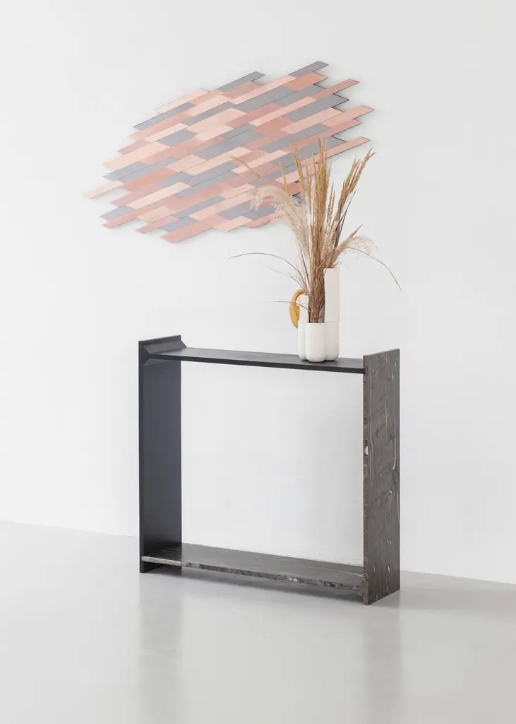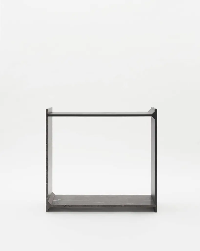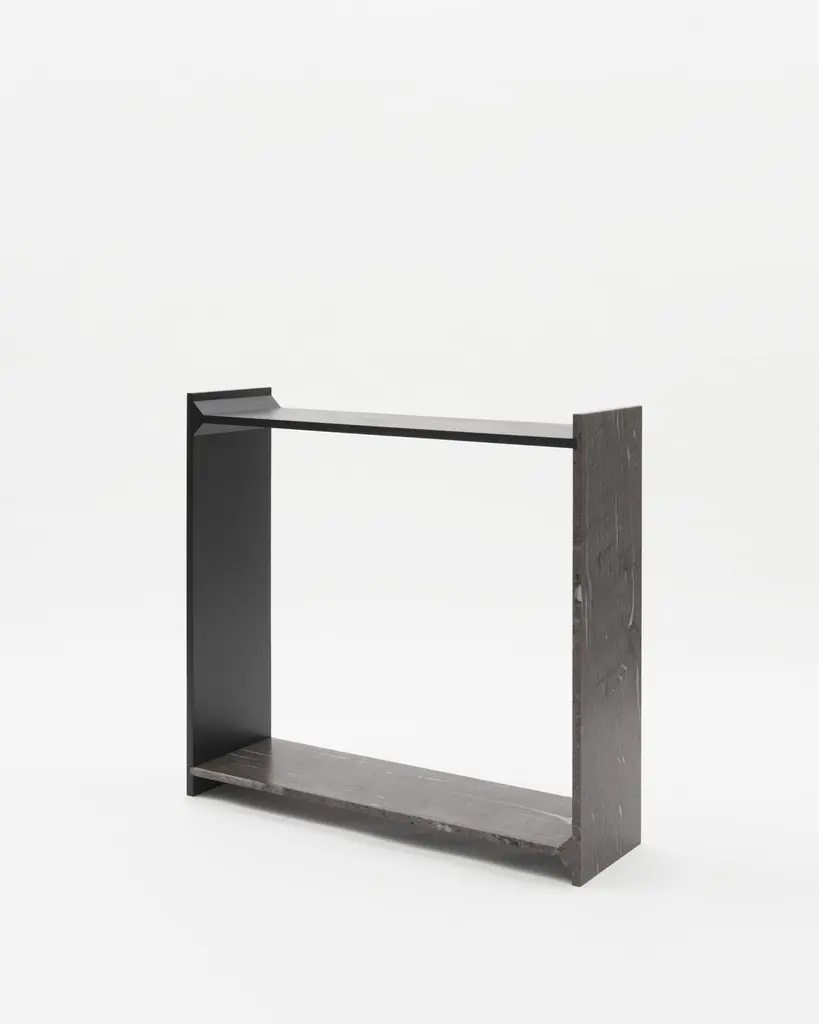 A-symmetry, a brown marble console by Frederic SaulouFrederic Saulou.Materials: Marble granite, massif oak stained.Dimensions: 100 x 95 x 29 cm.Edition of 8.Signed and numbered."While wandering in the streets I have been observing buildings construction toward the sky and found myself eagerly interested in slate material and ornamental stones.I am wondering about post-Industrial heritage of local mineral material and widen the range of possibilities in creating functional objects for the house and in questioning history, material and its usual impact between art and design. Thus, I want to distort, democratize and increase the value of this material as a future heritage and above all as a food for thought. To bring traditional and Industrial know-how face to face for creative purposes, to reinterpret the material in formal and conceptual ways so as to provide it a new understanding."Frederic Saulou's sculpted design artworks introduce a series of work coming from researches andpartnerships between local ateliers and designer, and implemented to another scale: That of the object and contemporary creation.Frédéric Saulou is a proeminent French contemporary designer.Born in 1989, Frédéric Saulou, lives and works in Rennes, in France. Graduated in space and environmental design at the Institut Supérieur des Arts Appliqués (LISAA) in 2011 and in object design at the Ecole Européenne Supérieure des Beaux Arts de Rennes (EESAB) in 2013, Frédéric will continue to perfect his experience within the Eric Gizard Associés agency and with the designer Frédéric Ruyant. In 2013, he founded the studio - Frédéric Saulou Design Studio - an independent and multidisciplinary design and consulting agency that sees design as a space for research and exchange that allows him to develop a sensitive approach to forms and materials. Experimentation and research take precedence over his work in order to think of new materials and new uses. This accompanies his daily approach so that each project is conceived as a sculpture in its own right, between simplicity and technicality. His approach guides him towards a global approach but also unique in his creations, thus creating particular interactions between the user and the object, between industrial craftsmanship. Today Frédéric works on various projects, from objects to space, in series or limited editions and collaborates with prestigious institutions and brands such as the publishing houses Ligne Roset, Drugeot Manufacture, Brossier Saderne, Vista Alegre, Esprit Porcelaine Limoges etc.