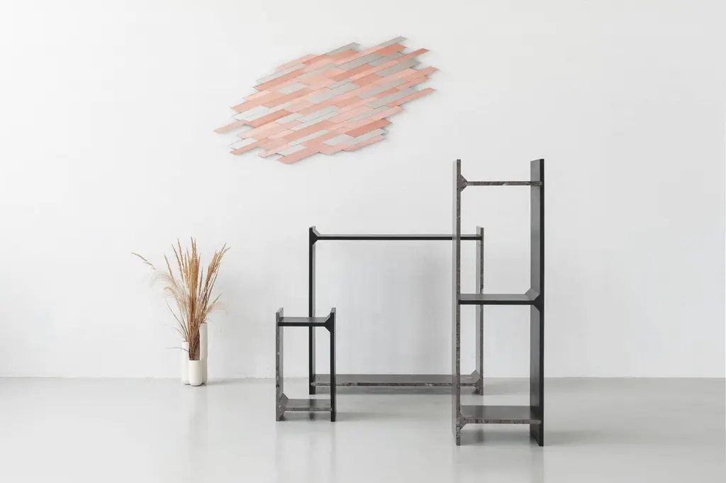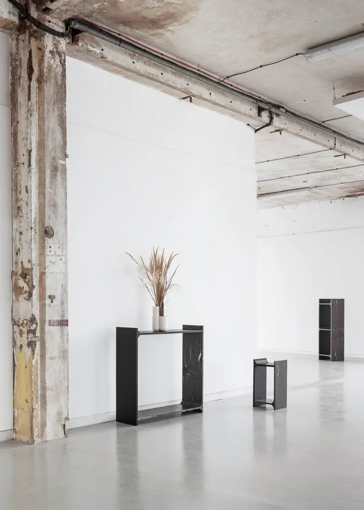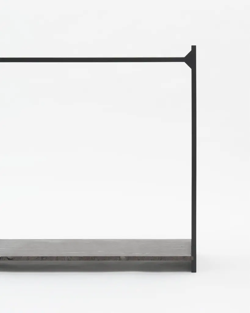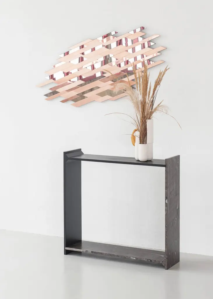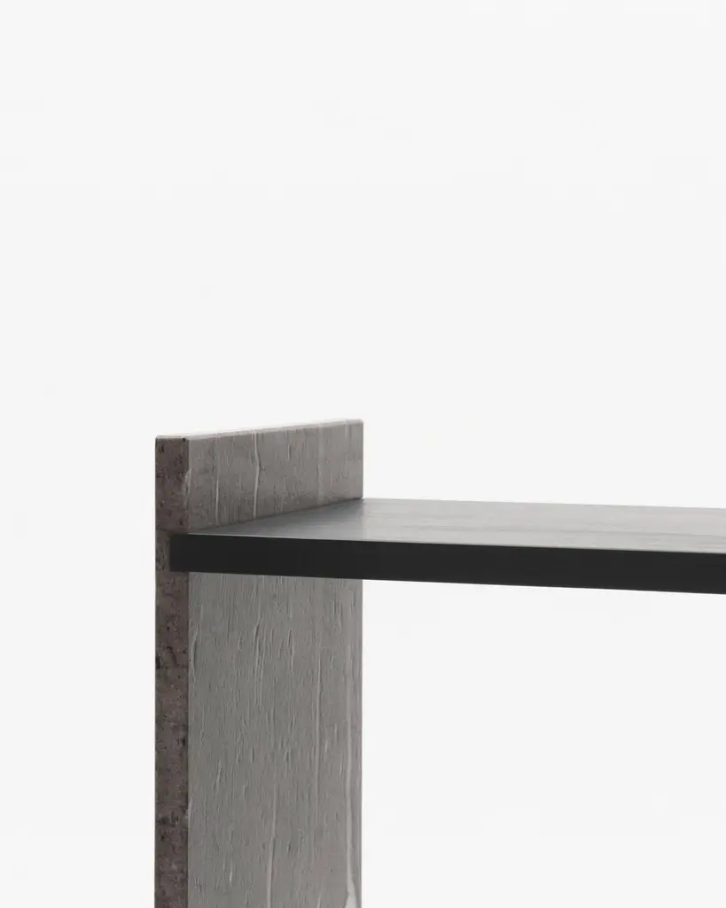 A-symmetry, a brown marble console by Frederic SaulouFrederic Saulou.Materials: Marble granite, massif oak stained.Dimensions: 100 x 95 x 29 cm.Edition of 8.Signed and numbered."While wandering in the streets I have been observing buildings construction toward the sky and found myself eagerly interested in slate material and ornamental stones.I am wondering about post-Industrial heritage of local mineral material and widen the range of possibilities in creating functional objects for the house and in questioning history, material and its usual impact between art and design. Thus, I want to distort, democratize and increase the value of this material as a future heritage and above all as a food for thought. To bring traditional and Industrial know-how face to face for creative purposes, to reinterpret the material in formal and conceptual ways so as to provide it a new understanding."Frederic Saulou's sculpted design artworks introduce a series of work coming from researches andpartnerships between local ateliers and designer, and implemented to another scale: That of the object and contemporary creation.Frédéric Saulou is a proeminent French contemporary designer.Born in 1989, Frédéric Saulou, lives and works in Rennes, in France. Graduated in space and environmental design at the Institut Supérieur des Arts Appliqués (LISAA) in 2011 and in object design at the Ecole Européenne Supérieure des Beaux Arts de Rennes (EESAB) in 2013, Frédéric will continue to perfect his experience within the Eric Gizard Associés agency and with the designer Frédéric Ruyant. In 2013, he founded the studio - Frédéric Saulou Design Studio - an independent and multidisciplinary design and consulting agency that sees design as a space for research and exchange that allows him to develop a sensitive approach to forms and materials. Experimentation and research take precedence over his work in order to think of new materials and new uses. This accompanies his daily approach so that each project is conceived as a sculpture in its own right, between simplicity and technicality. His approach guides him towards a global approach but also unique in his creations, thus creating particular interactions between the user and the object, between industrial craftsmanship. Today Frédéric works on various projects, from objects to space, in series or limited editions and collaborates with prestigious institutions and brands such as the publishing houses Ligne Roset, Drugeot Manufacture, Brossier Saderne, Vista Alegre, Esprit Porcelaine Limoges etc.
