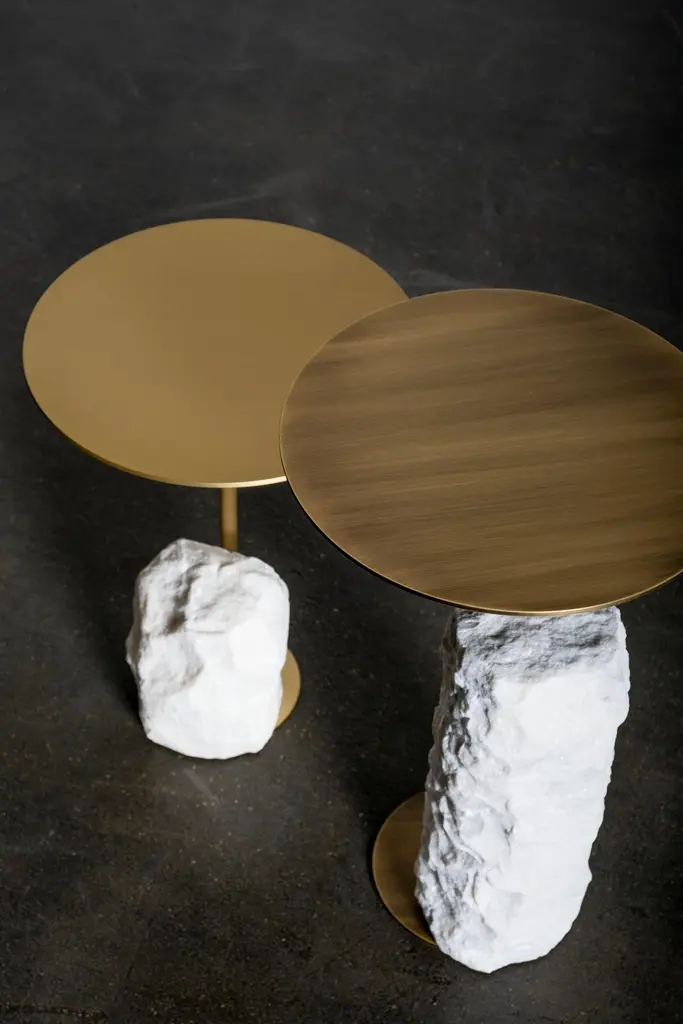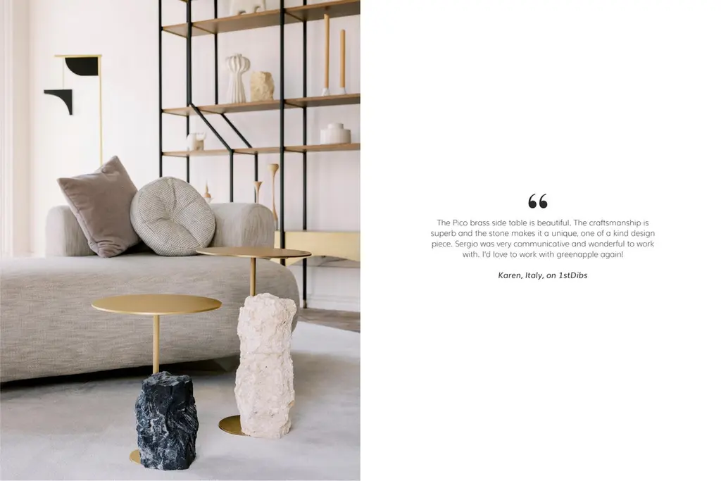 Pico Side Table, Contemporary Collection, Handcrafted in Portugal - Europe by Greenapple.The Pico marble side table draws inspiration from the striking landscapes of Pico Island in the Azores, seamlessly bringing nature’s grandeur into contemporary interiors. With its sculptural presence, the Pico marble side table embodies the raw elegance of the island’s towering peak, blending modern design with organic textures. A tribute to nature’s raw beauty, the Pico marble side table introduces a bold and grounding presence to any space.The Pico side table features a brushed brass structure with a matte varnish. Its base block is crafted from bush-hammered Calacatta Bianco marble, showcasing a split-face effect that enhances its white tones and cream veins.It is suitable for indoor and outdoor use.The Pico side table can be customized in terms of dimensions, materials and finishes.Pico Side Table Material CodesST020 Calacatta Bianco Marble, Bush-Hammered, Honed, White-Cream, MatteME030 Brass, Brushed, Varnished, Brushed-Brass, MatteHandcrafted in Portugal - Europe by GreenappleUnique by design, Crafted by peopleGreenapple transforms contemporary spaces into exclusive narratives of design and craftsmanship. From custom-made furniture to bespoke interiors, each creation is a timeless work of art, shaped by master artisans who honor centuries-old techniques.Founded in 2005 by Sérgio Rebola and Rute Martins, Greenapple has earned global recognition among high-end clientele and leading design firms. While Rute designs each unique piece, Sérgio ensures uncompromising quality from design to production and from production to your home. We provide a seamless experience, offering short production lead times, worldwide delivery within 7 to 10 days, and white-glove service upon request.For U.S. clients, we can handle customs clearance, and offer white-glove service as well upon request.End Table, Accent Table, Drink Table, Utility Table