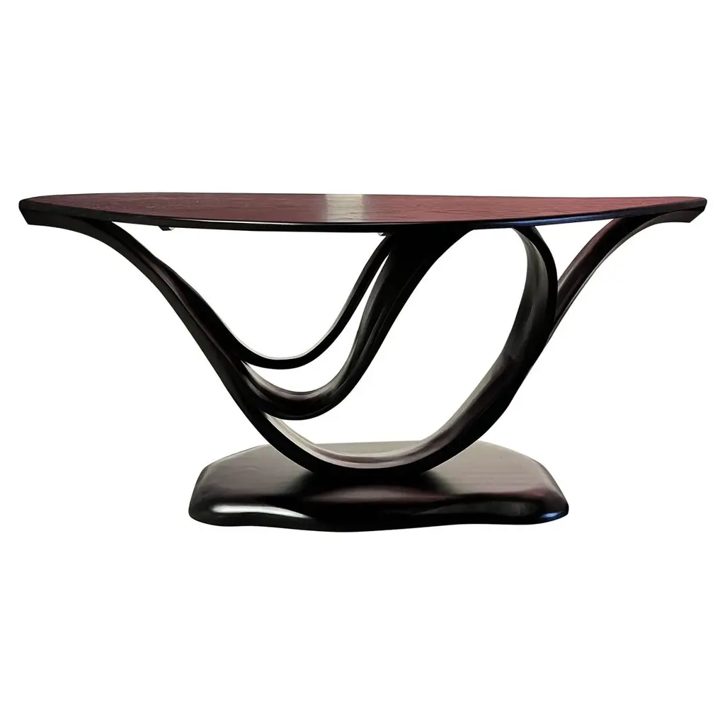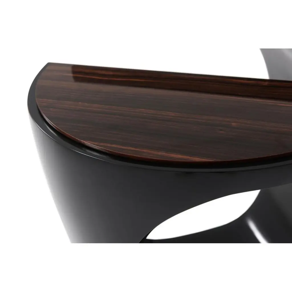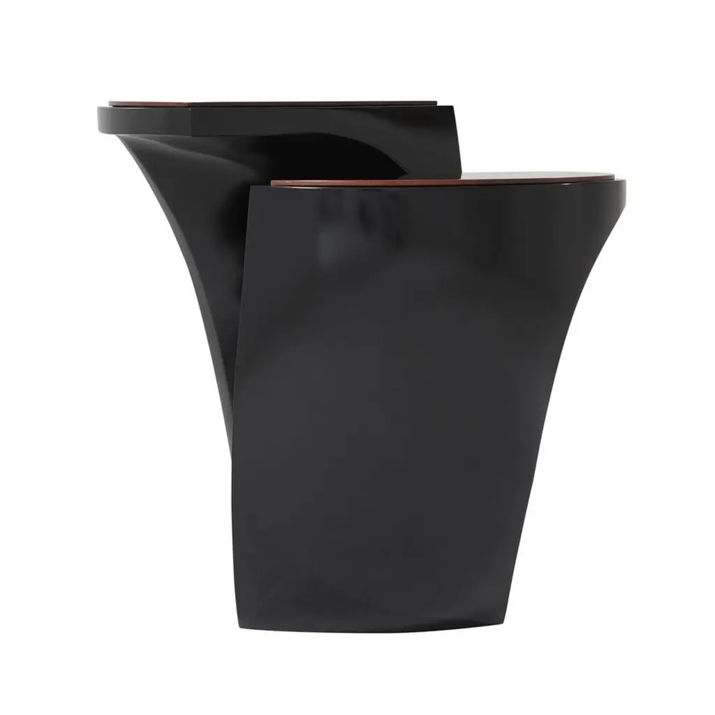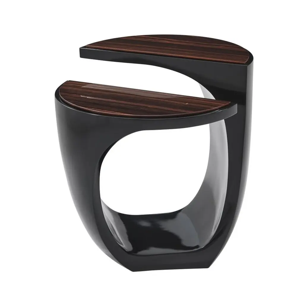 An organic modern two-tier split side table with exotic veneered tops with stepped edge details on a twisted curved form black lacquered base.Dimensions: 27.25" W x 24" D x 26.5" H.