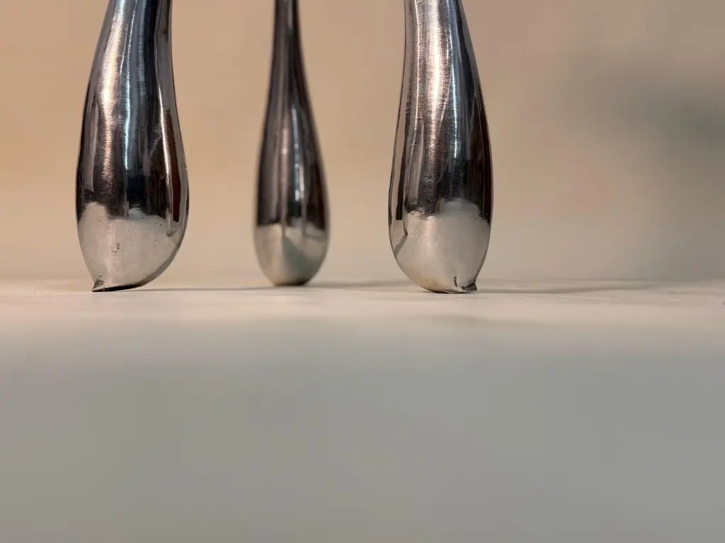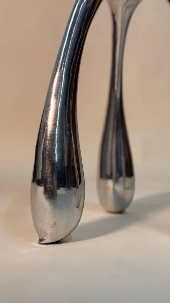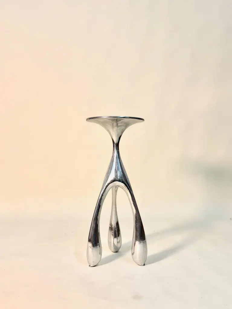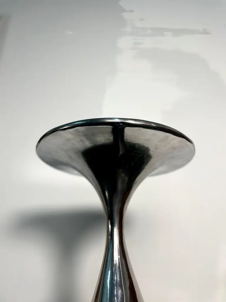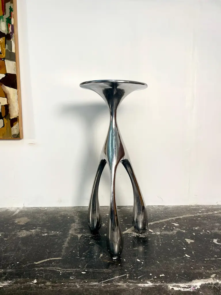East Gueridon Pedastal Table / Side Table in Solid Cast Aluminum by Jordan Mozer, USA, 2005Incredible biomorphic and organic side table by Jordan Mozer. This metal table was designed for East Hotel is the reincarnation of the bombed out ruins of an old foundry in Hamburg, Germany as a boutique hotel . The piece reflects the inspiration of surrealism and Gaudi . The table seems to be waving in the reflection of a carnival mirror. At once, moving or as seen underwater. It has sinuous curves in all the places. Not a straight line in sight. This piece was exhibited in the Chicago Art Institute's Young Chicago show and is part of the museum's permanent collection. Made in Chicago.Created in 2002-2004 for East Hotel.Hand-carved wood forms were cast in recycled magnesium-aluminum alloy. The castings were hand polished. Made in Chicago.Dimensions: 30"H x 12"W