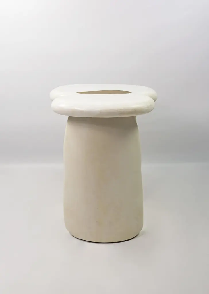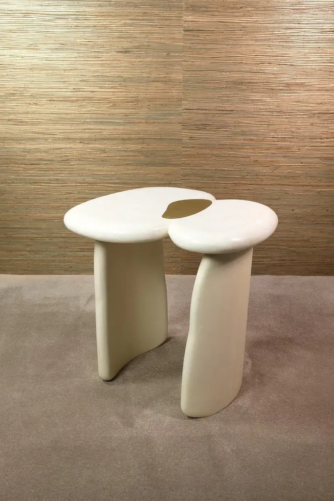 This organic shaped side table is made of white rock crystal marquetry top with a textured brass decor (hammered).The base is made of ivory colour parchment.Dimensions:18.1" x 15.75" x H17.3" (46x40x44cm)Care instructions:To clean, simply wipe with a dry clean clothDo not use any cleaning agent on the surfaceThis piece is 100% handmade by our talented team of master craftsmen.