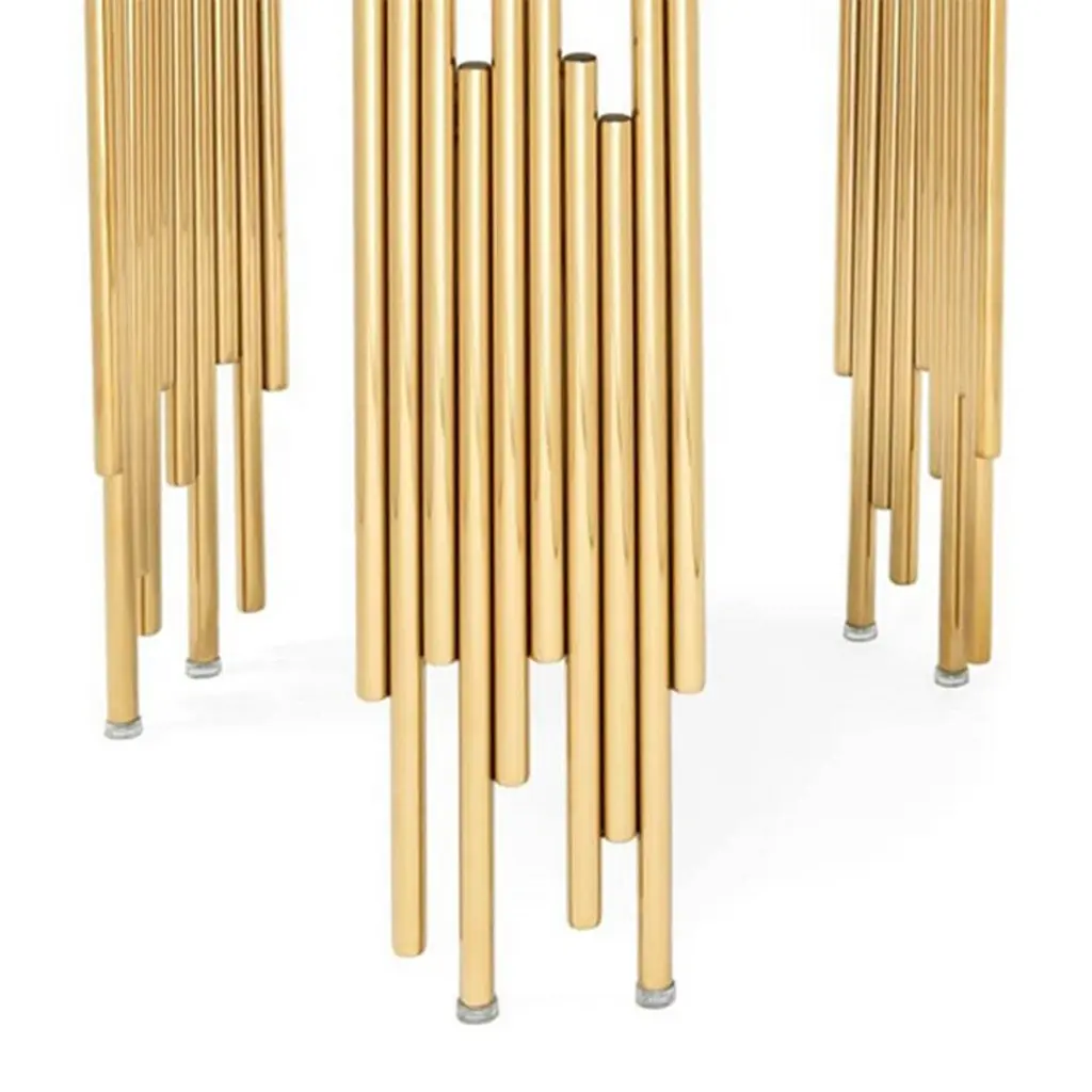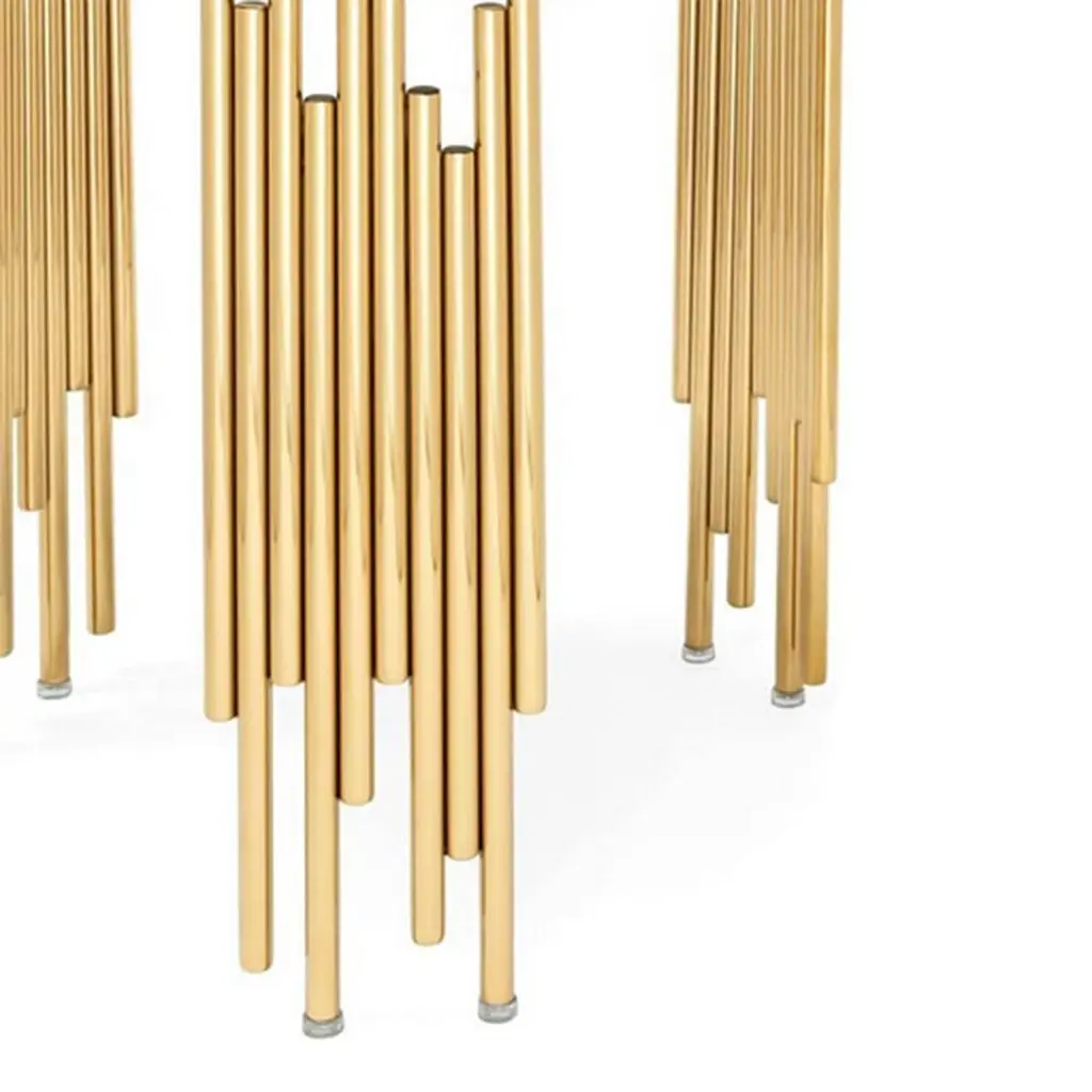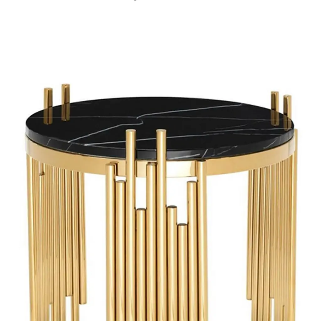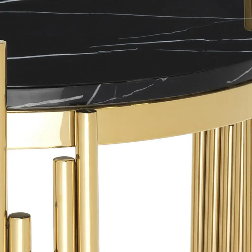 Side table Ororods round with steel structure ingold finish and with black marble top.