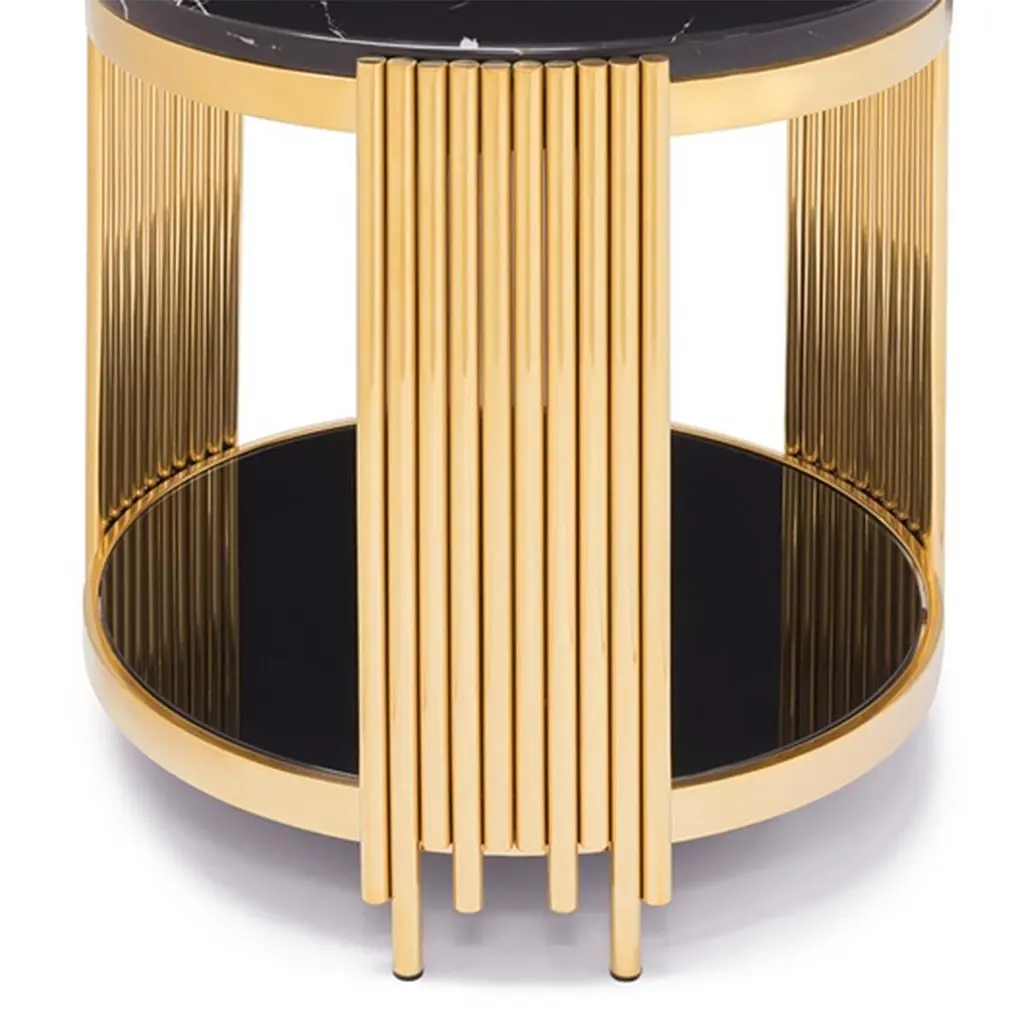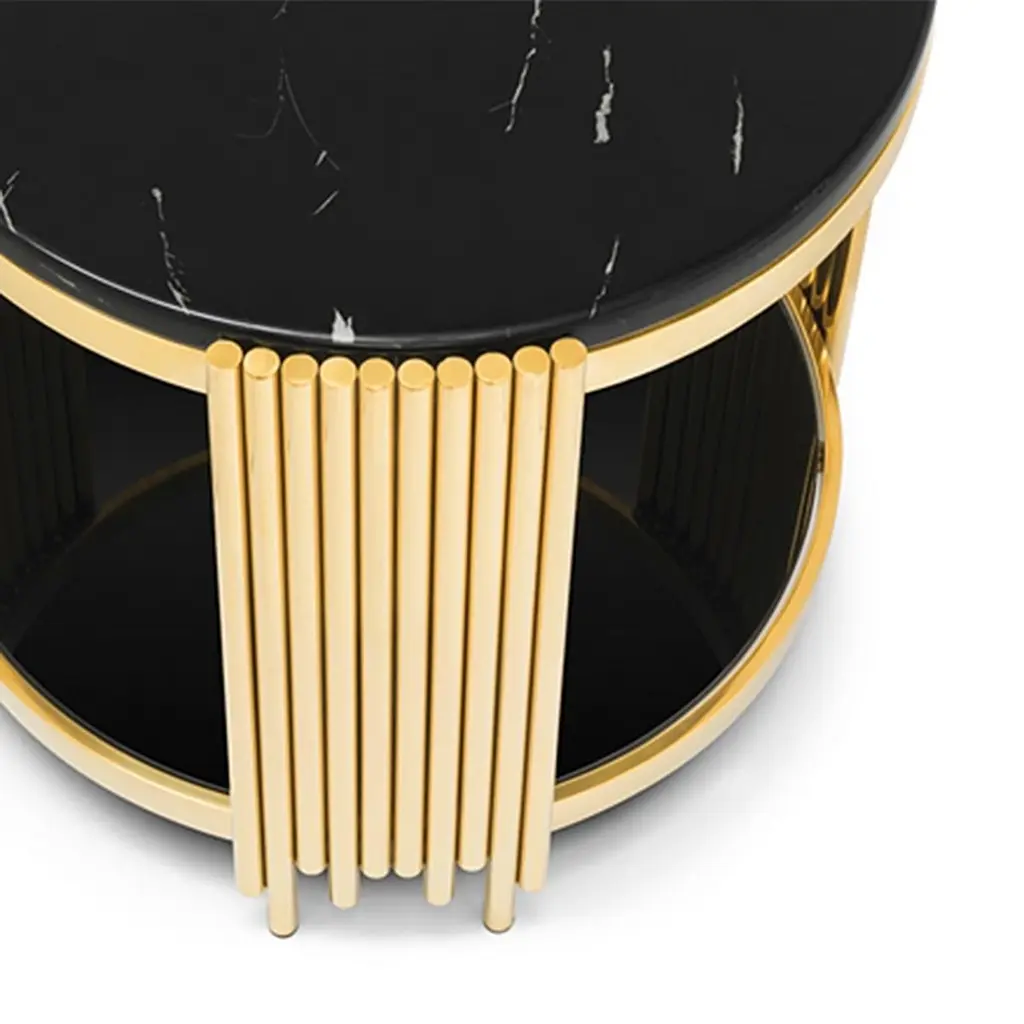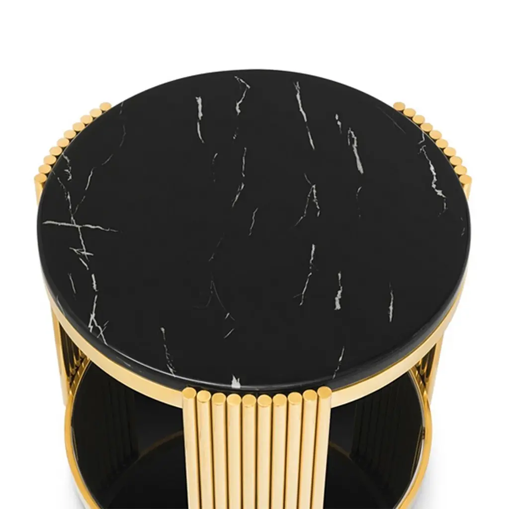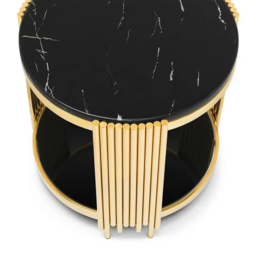 Side Table Ororods Rounds with structure in steel in gold finish, with black resin marble up top and with black glass bottom top.