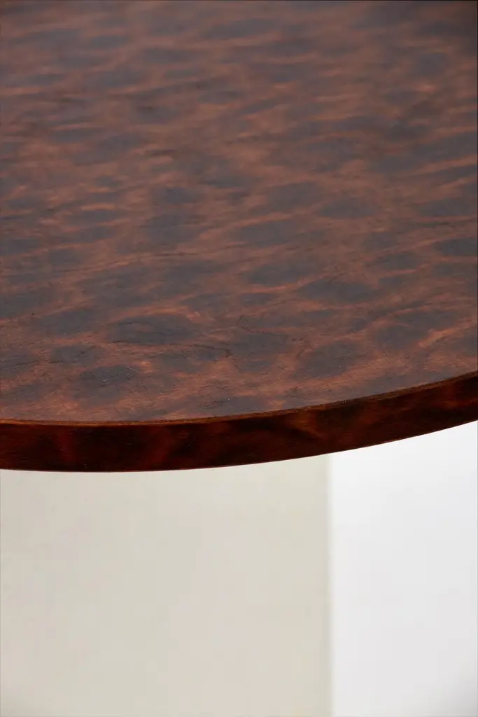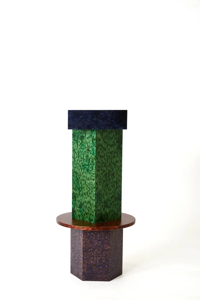 The surface finish OSIS is an innovation developed by the Berlin-based studio LLOT LLOV, who studied the osmosis effects caused by salt on wood. The surface is painted monochrome or multi-color, and then salt is spread on the wet surface. Salt has the ability to absorb liquids from its surrounding as well as draw in the pigments of paint. The results are affected by the kind of salt used, humidity and length of reaction time. A series of experiments shows that big crystals tend to create big rims with strong contrasts, whereas fine crumbs of salt trigger more differentiated patterns with softer gradients. When combined with spruce wood, the salt draws the pigment into the natural flow of the grain, emphasizing the unique features of the original material.With OSIS edition 5 LLOT LLOV is deepening their understanding of the impact of salt on pigment. Color and surface patterns enter into a kind of dialogue with the shape of the modules. The table tops and bases are available in different colors and patterns via customization, though once fabricated table top and base are permanently connected.