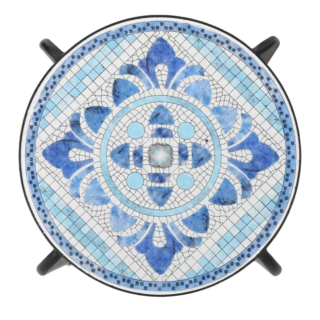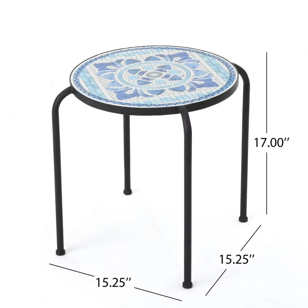 Osparple Curved Table Legs Mosaic Pattern Outdoor Patio Table Iron Small Outdoor Side Table Modern Small Patio End Tables For Terrace, White+blue