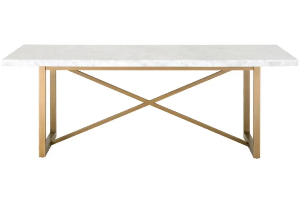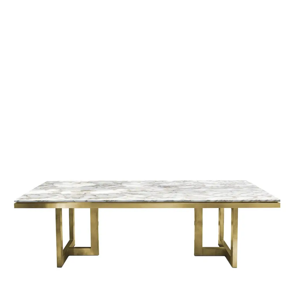 Timeless and majestic, this dining table is a one of a kind, superb example of traditional craftsmanship, combined with the use of precious materials. The base in wood features two sets of feet with a lavish gold leaf that strikingly complements the top in Calacatta marble framed in brass. The one of a kind, bold veining of this stone on its crisp white background lends a luxurious quality to the piece that will make a sophisticated statement in any home.