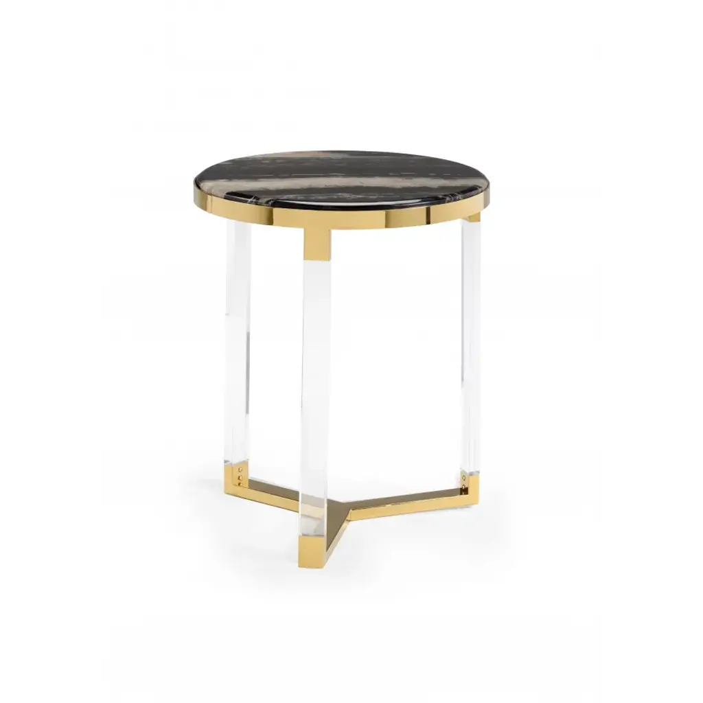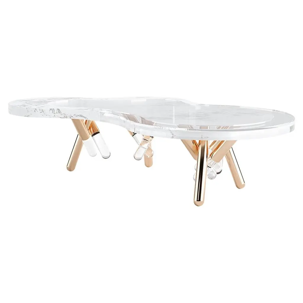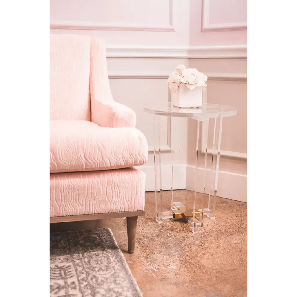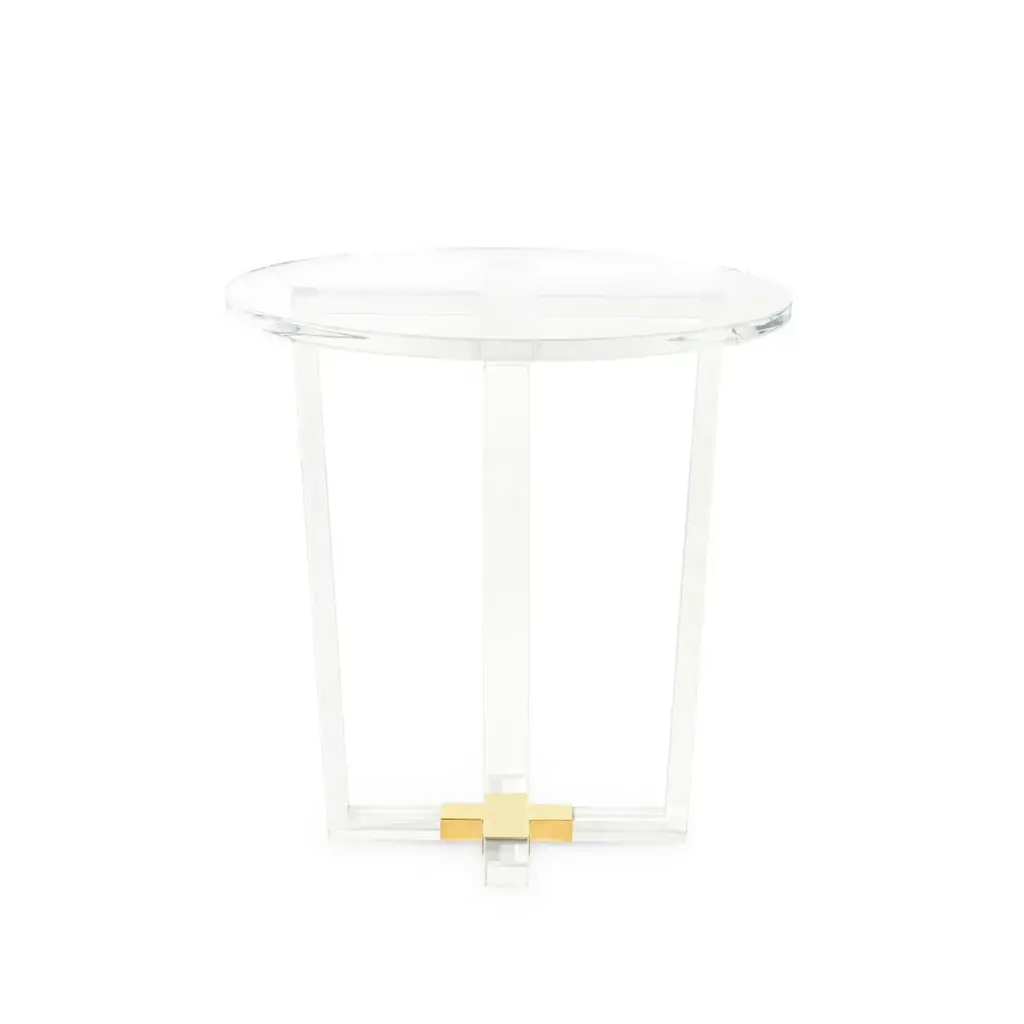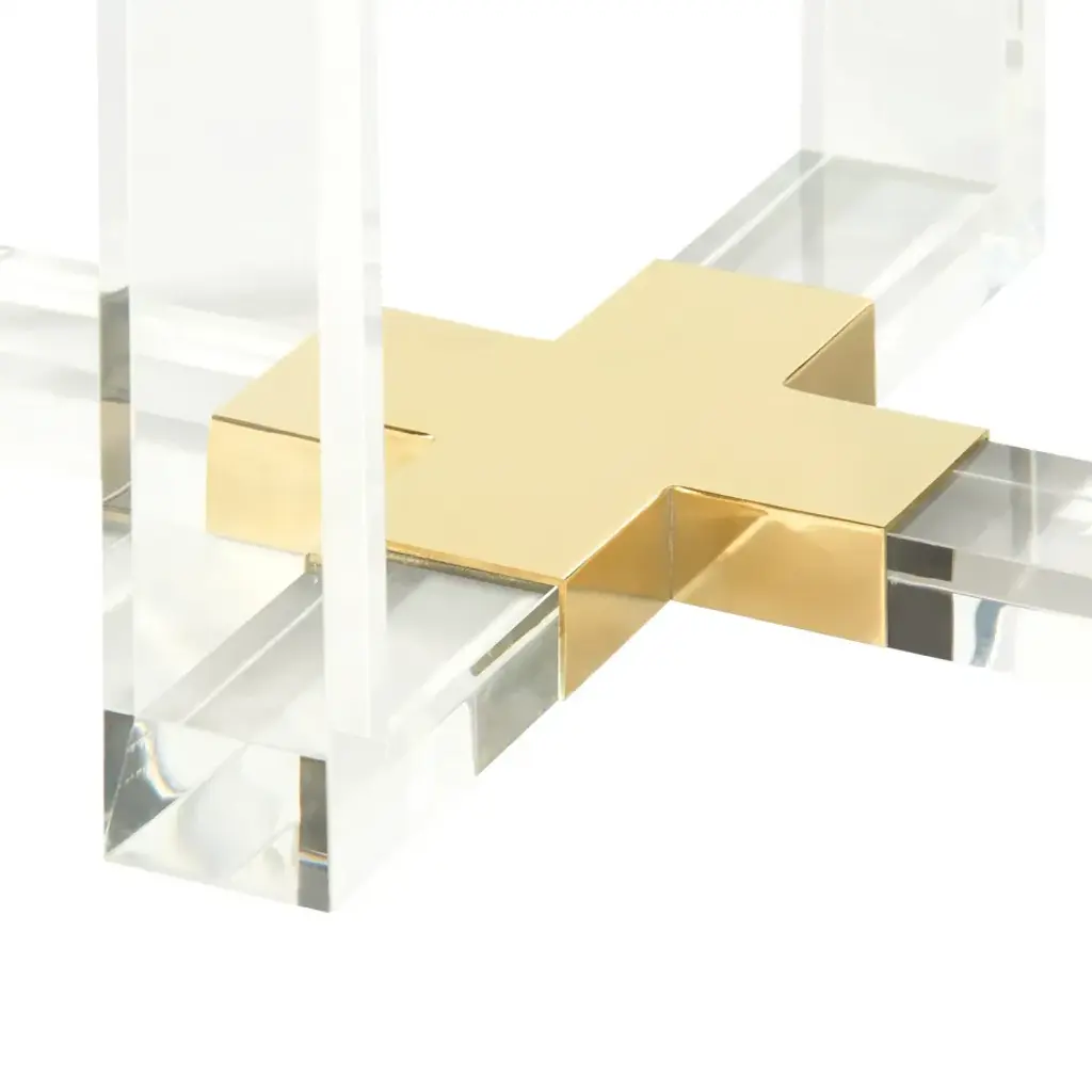 The Otis Side Table embraces the glamorous spirit of 1920s Art Deco design, reimagined through a modern lens. It’s chic, petite, and ideal for floating as a drinks table during grownup cocktail parties. Its splendid shine and elegant look, however, will certainly have you making it a permanent fixture next to a sofa or lounge chair. Gemlike sparkle, akin to the facets of a diamond, is achieved through its construction of clear acrylic. Its architectural silhouette is created from a bold formation of subtly slanted legs, which coalesce at the base and are brought together with an ornamental stamp of polished brass—an understated accent that makes a glittering impression. Consider the Otis a functional bijou that dresses up any room.