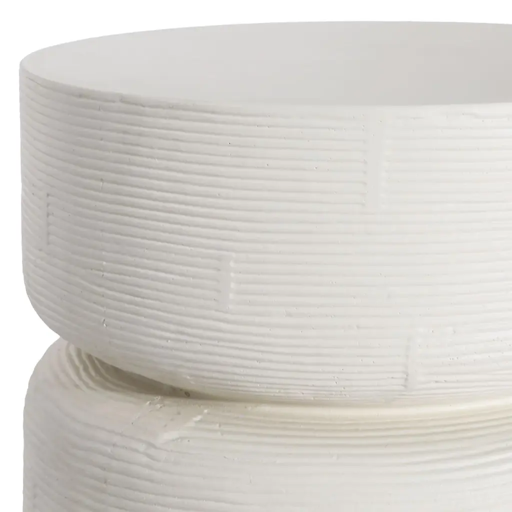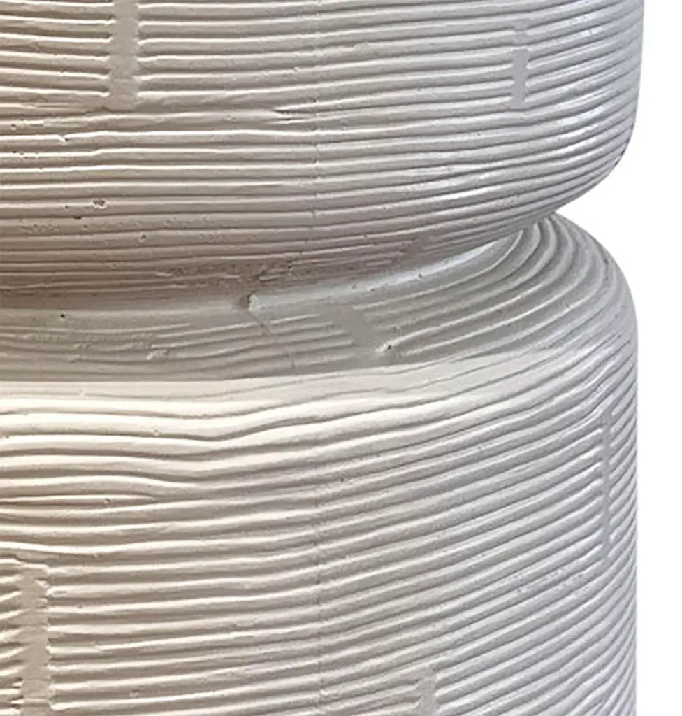 Beautiful cream ivory finish round cement side table. Round table with hand-etched grooves around side which creates for an organic enticing texture. Perfect for outdoor or indoor use. Each slightly unique due to nature of material and handmade details. Weight is approx. 70 lbs.