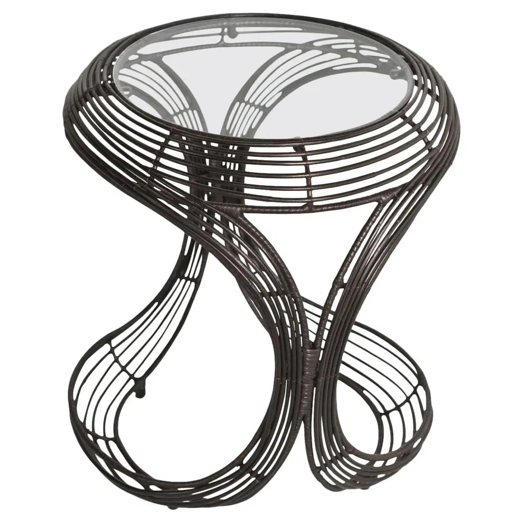 Outdoor manolo end table by Kenneth Cobonpue.Materials: Polyethelene, nylon, steel, glass.Also available in other colors and for indoors. Dimensions: Glass Diameter 31.5 cm x height 6mm.Table 45 cm x 50cm x 50cm. Taking inspiration from the curves of a woman’s sandal, Manolo’s playful loops make for intriguing and elegant forms. This collection stands out with its light and fluid-structure.Designer's BiographyKenneth Cobonpue is a multi-awarded furniture designer and manufacturer from Cebu, Philippines. His passage to design began in 1987, studying Industrial Design at the Pratt Institute in New York. While completing his studies, he apprenticed for a leather and wood workshop near Florence, Italy. He went on to study Furniture Marketing and Production at the Export-Akademie Baden-Württemberg in Reutlingen, Germany, under a private and state scholarship program, and subsequently worked in Bielefeld and Munich.Kenneth returned home to Cebu in 1996 to manage Interior Crafts of the Islands, Inc., a furniture design and manufacturing company founded by his mother Betty Cobonpue in 1972. Discovering that modern design could have a new face using natural fibers and materials, Kenneth created pieces of functional art, offering an alternative to the Western definition of modern design. Today, the Kennethcobonpue brand has become known globally for its unique designs and extensive roster of clientele, including Hollywood celebrities and members of royalty.With his masterful way of integrating nature, traditional craft and innovative technologies, designer and creative director Kenneth Cobonpue has earned international awards and recognition for his creative, organic, and expressive pieces. Working closely with some of the world’s leading designers, from household names to emerging talents, Kenneth has been pushing the envelope for design in the Philippines and sharing his vision to a global audience. Awards to his credit include five Japan Good Design Awards, the grand prize at Singapore International Design Competition, the Design for Asia Award of Hong Kong, the American Society of Interior Design Top Pick selection and the French Coup de Coeur award. Several of his designs were selected for several editions of the International Design Yearbook published in London and New York. Phaidon’s book entitled “& FORK” underscores Kenneth’s position as a leader of a new movement incorporating new technologies with crafts. In 2007, TIME magazine called him “rattan’s first virtuoso”. Kenneth was named the Designer of the Year in the first edition of Maison et Objet Asia held in March 2014 in Singapore.Kenneth reveals new work each year in the design shows from Milan to New York, and he speaks regularly about Southeast Asian design all over the world. He has also appeared in European television and in countless international magazines and newspapers around the world. Various Cobonpue designs have also appeared in full-length feature films and television, such as Oceans 13 and CSI.