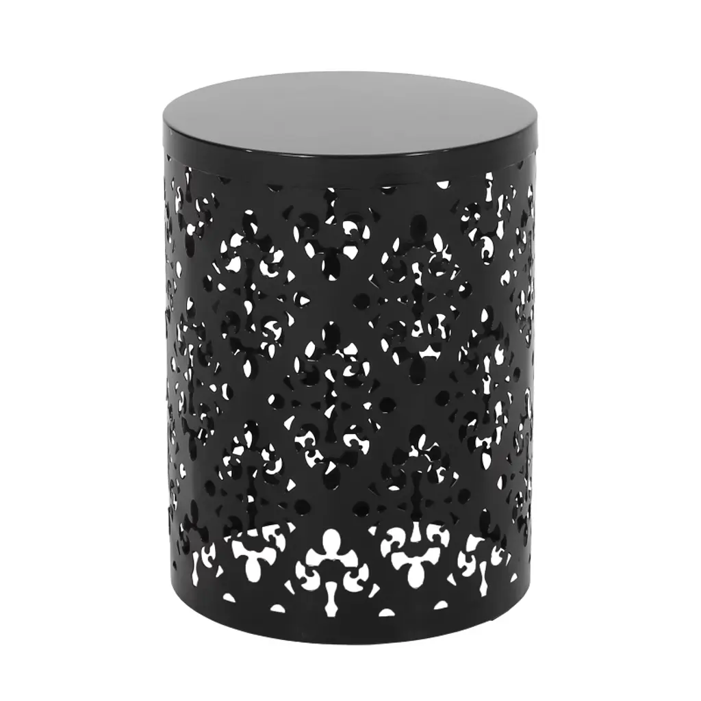Product Description Keep your favorite summer essentials close to your side with the help of a wonderfully stylish accessory. With a sleek, modern cylindrical structure and hollow framework, this end table is an excellent sidekick to your existing outdoor furniture, perfect for holding a tray of snacks or a fresh pitcher of lemonade. The frame of this side table features an elegant iron cut design with a beautiful floral pattern, making this piece great for any area in need of something new.