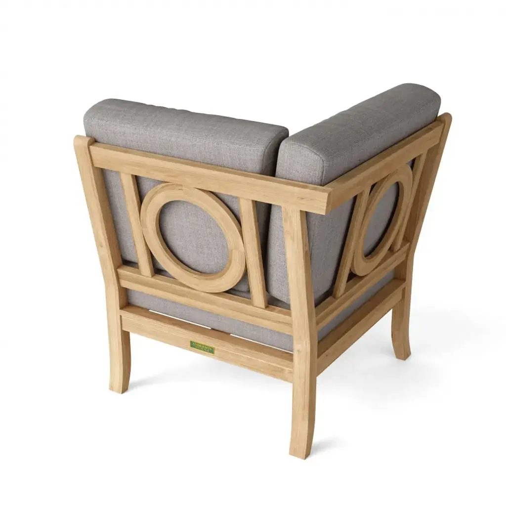 The corner piece of the Natsepa Deep Seating Collection built from Grade-A teak and finished kiln dried features tapered legs, arched back, and the Natsepa circular themed motif. As the corner piece of the set, add the Center Chair, Left Chair, Right chair, Ottoman footrest, a coffee table, and a side table from the Natsepa Deep Seating Collection for a complete deep seating set. Includes Sunbrella All-Weather cushions 27” deep and 6” thick from a variety of fabric patterns and color options. Built from genuine Grade-A Teak sanded smooth without finish, it is the perfect chair for your outdoor needs.