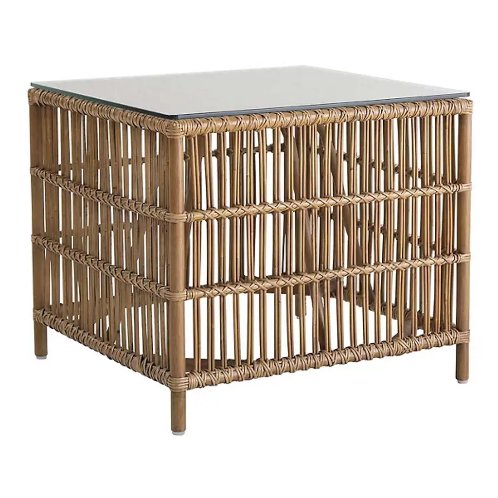 Complete your outdoor seating with this boho-inspired side table, offering a chic and unconventional touch. The textured rattan wrap and drum shape provide both style and stability, while the handcrafted details ensure a unique look. The tempered glass top offers a smooth, durable surface that is stronger and safer than regular glass. Built with a powder-coated iron frame, this table is designed to withstand heavy use and weather conditions, perfect for enhancing your patio decor.