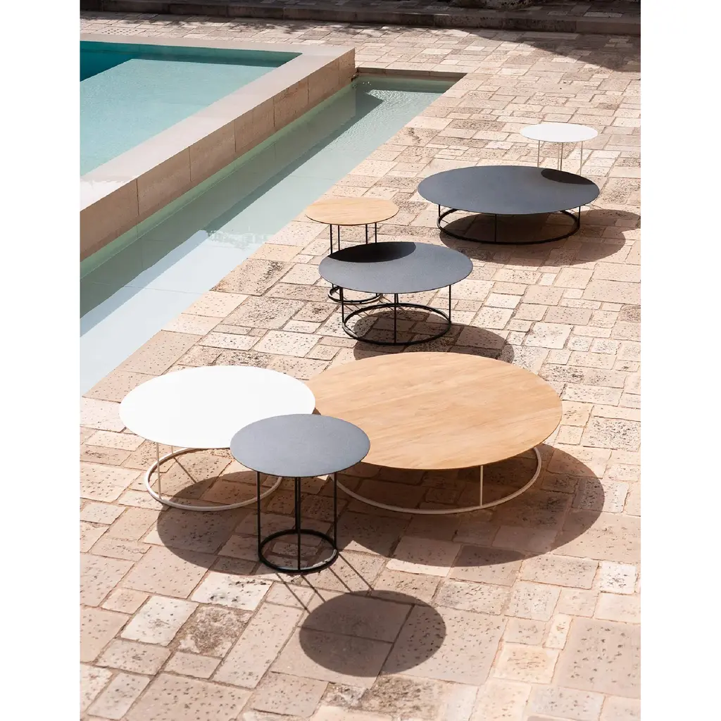 ZEFIRO is an articulated family of low tables with a round top resting lightly on a structure that is slender only in appearance. Lightness and transversality define this collection of outdoor low and side tables, adaptable to different contexts and uses thanks to their shapes, sizes and finishes; the structure is in stainless steel, while the top is in aluminum – in two possible colors – or in natural teak wood.