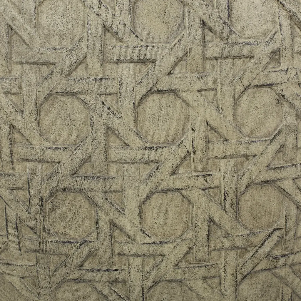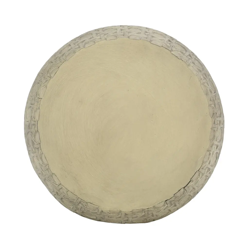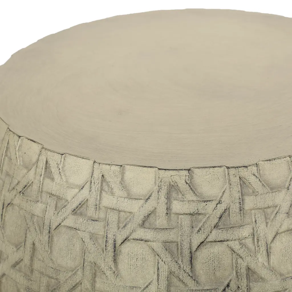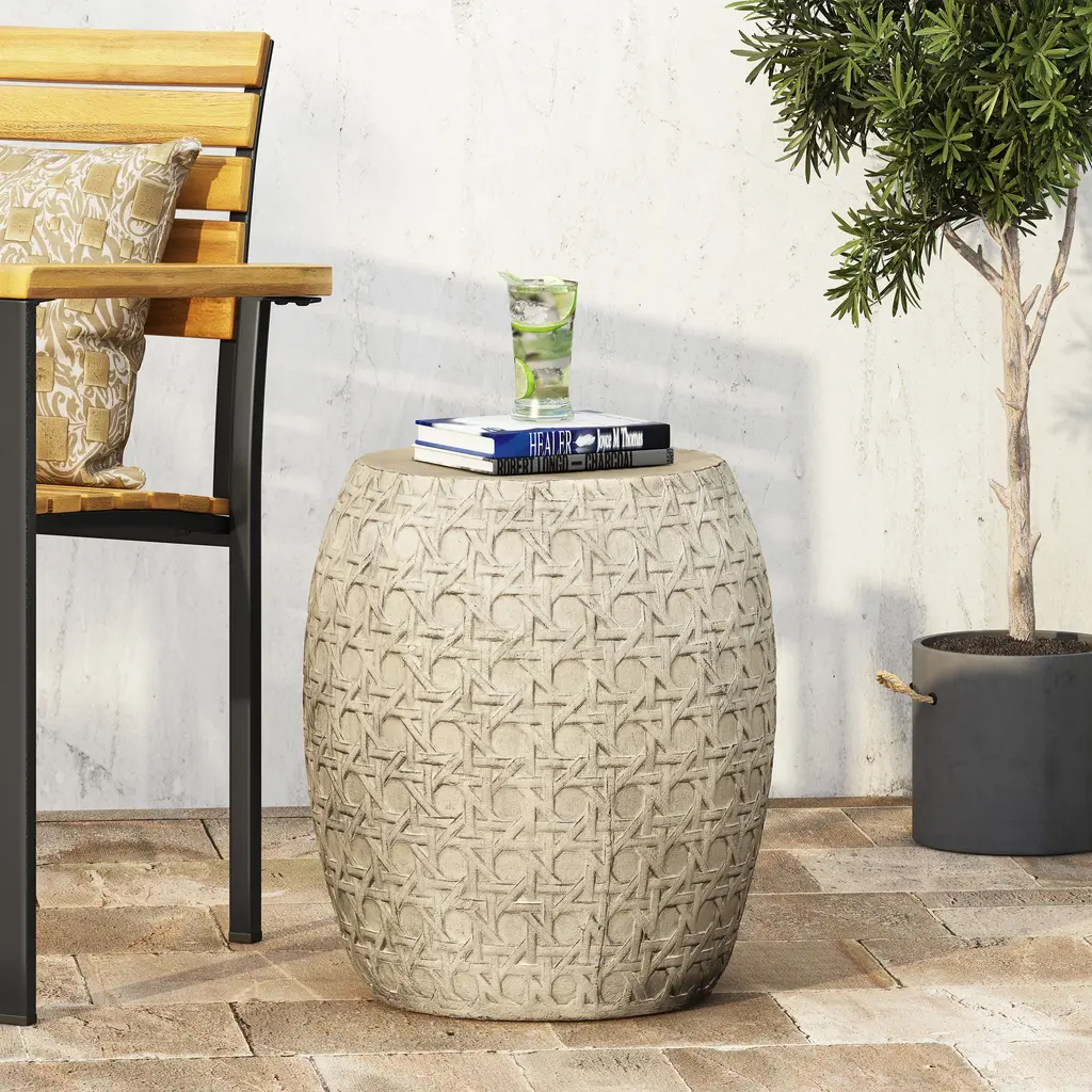 Enhance your space with this outdoor side table featuring a unique barrel structure and intricate cane wicker pattern. The boho-inspired design blends earthy textures with a minimalistic style, adding charm to any setting. Constructed from lightweight concrete, it offers a smooth, durable surface that withstands the elements. Sturdy enough to resist strong winds yet light enough to move easily, it adapts to both indoor and outdoor use. Ideal as a coffee table, end table, or plant stand, it brings versatility and style to your patio or living space.