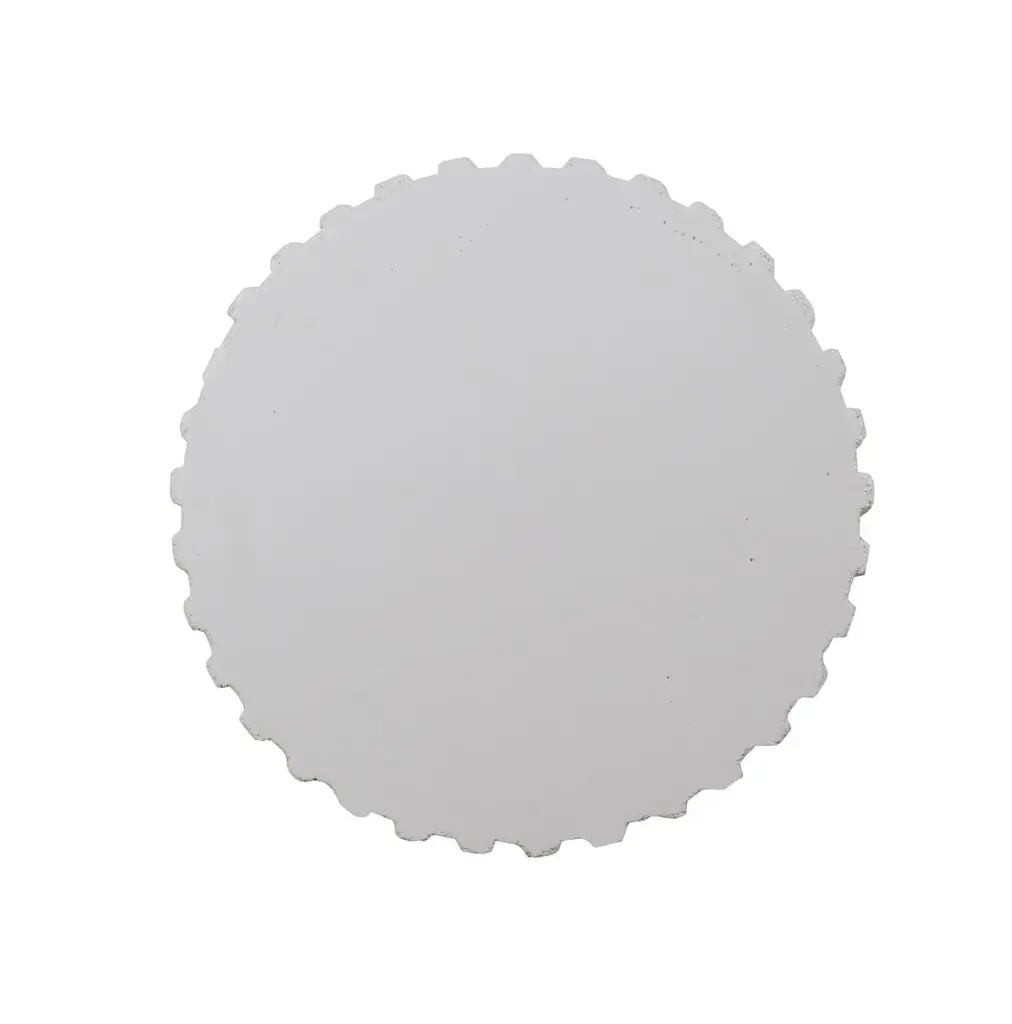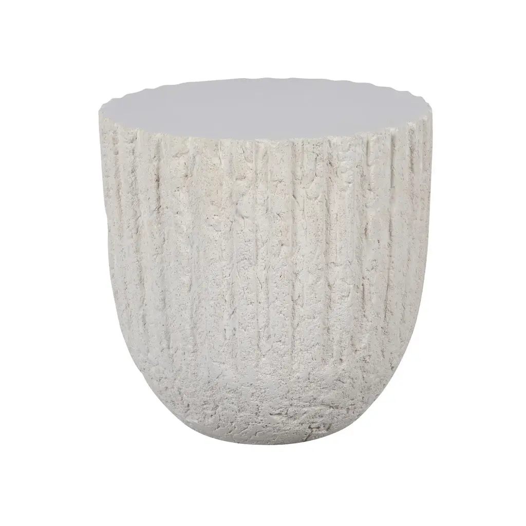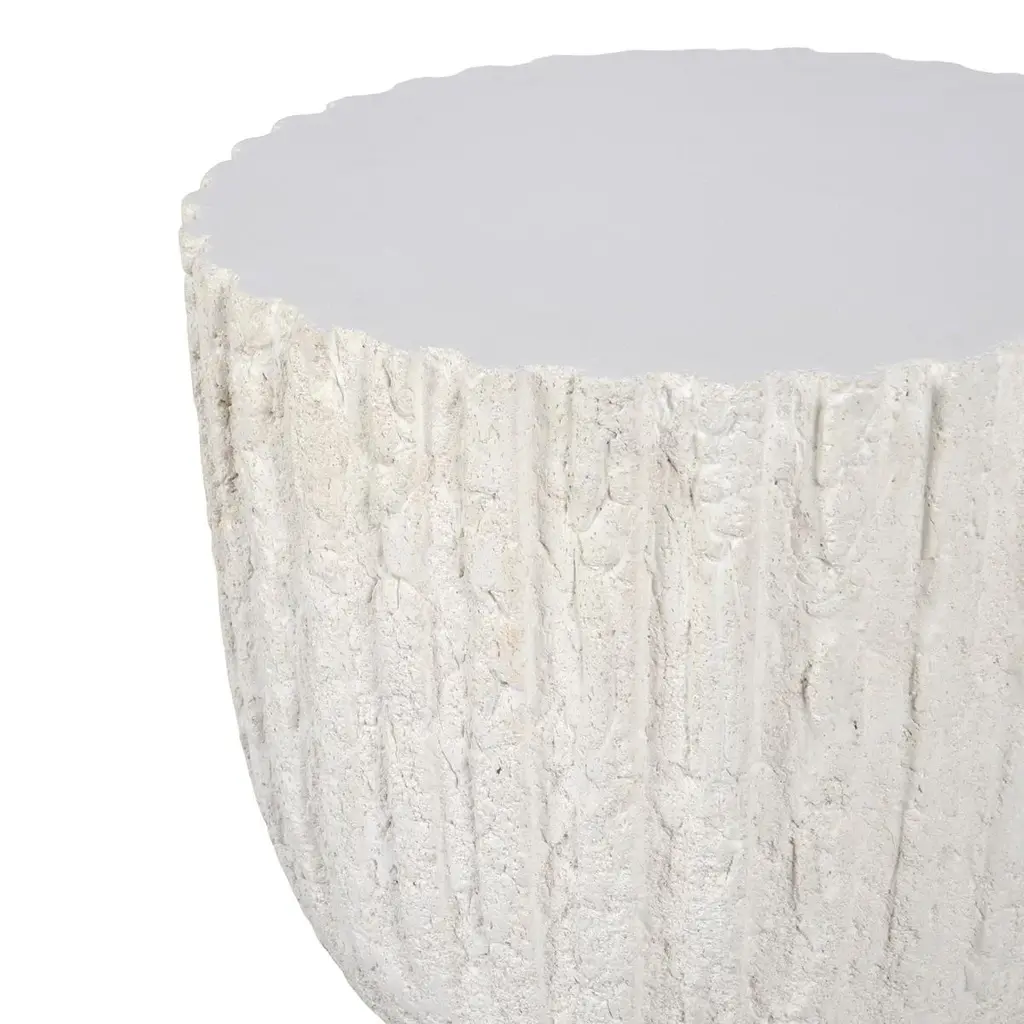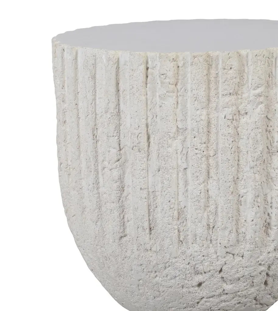 Attractive chiseled rough white cement resin side table with level smooth top. Great textured accent piece used indoors or for exterior use. Each table will have variations in exact tones, textures, and natural imperfections.