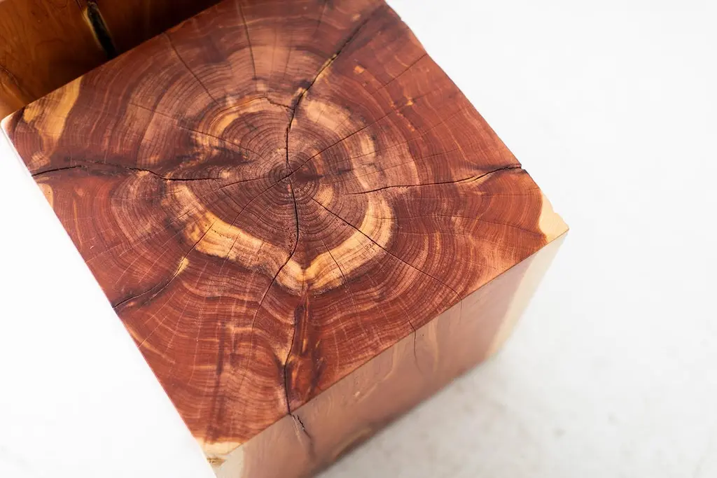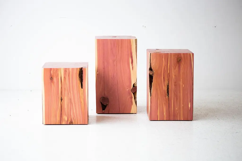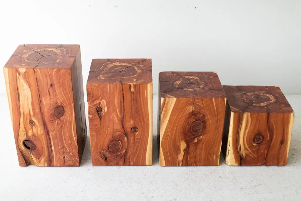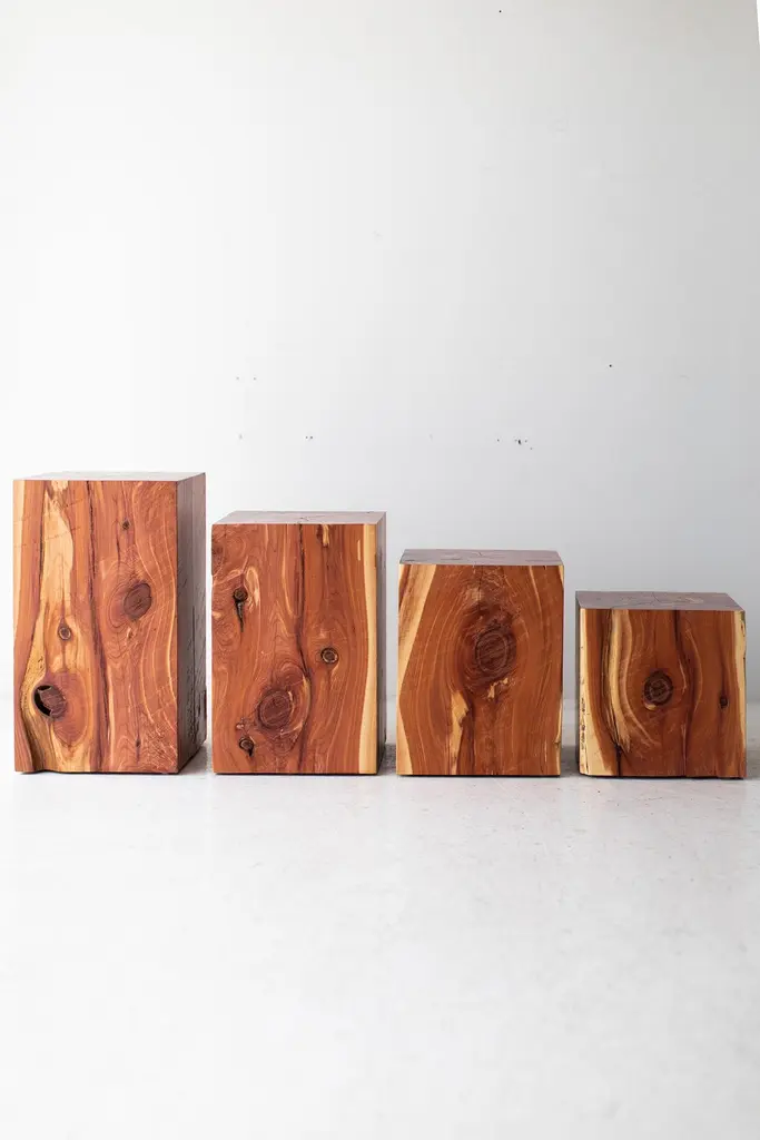 Due to the size of red cedar trees we need to accomplish this square shape, these could have more character than our maple squares. Please view all photos to see what you can expect.Please scroll down to read IMPORTANT INSTRUCTIONS ABOUT OUR STUMPS before purchase!Please note, we have upgraded to a more durable outdoor finish with extra UV protection. With the extra durability comes more of a glossier finish. Please refer to photo #2 which shows the true new outdoor finish.These stumps are handmade from our family to yours! Our stumps are now kiln dried! This process helps with major cracking, moisture issues, and bugs!PLEASE NOTE : These stumps will age naturally, and even more so being outdoors and exposed to the elements. Each is a solid log with its own unique character so we can not guarantee the finish won't fade or discolor as this varies per climate and log. This outdoor wood stump side table is made in the heart of Ohio with locally sourced wood. The stump can be used for a side table, a stool, or grouped together for a coffee table. Each stump is made from a solid trunk of rough cut red cedar and each is hand sawed, sanded, and sprayed with a commercial grade exterior finish. Every part of the process is handled with care to honor the unique markings of each tree. PLEASE NOTE: THESE ARE PRONE TO CRACKING. WE LOVE THE LOOK BUT THESE DEFINITELY ARE NOT FOR THE PERSON WHO WANTS A PERFECT SQUARE.... LOTS OF CHARACTER. Cracks can even be as big as 1/2" wide due to proper drying in our kiln. The idea is that most of the cracking happens before it is sprayed, shipped, and in its new home. These are all slightly different in character and they may vary in size - No two pieces are exactly alike. Our team and clients absolutely love these."I love natural elements. I'm inspired by them and I love being surrounded by them. I also love modern furniture and accessories. When thinking of new products a few years back, I wanted to do a modern twist on something considered rustic and "country".Thus the whitewash stump table was born! It's important to our family to not only design and manufacture beautiful things, but to provide the best quality and experience. There is a lot of love that goes into each stump, as we hand pick and finish each one per order. Add a little piece of nature to your home in a modern way!" -- Gretta Jones // Bertu HomeIMPORTANT INFORMATION ABOUT OUR STUMPS...1. Please unpack your stump immediately and leave it out of any packaging. These are real pieces of wood and need to breathe!2. For OUTDOOR stumps : Though these are kiln dried and the wood can be used outdoors, sometimes when they arrive in different climates, humidity levels adjust and can affect the finish on top. We see this more often in direct sunlight. We do our very best and continue to make sure there are no issues, but we can not control climate. Solid wood and the elements are unpredictable and we will not be liable. The great thing about these logs is you can always sand them down and refinish.3. Wood naturally moves. These are solid pieces and for that reason, they are prone to cracking. You may get more cracks or bigger cracks in the first few weeks as the wood acclimates to its new home and climate.4. These stump tables have nylon glides (feet) underneath not only to make them easier to move around (they are heavy!), but also so there is nice air flow to the wood. The air flow is most effective on hard flooring. If you put these on rugs or carpeting, we suggest checking on the underside of your stump periodically to prevent any issues.5. We are not liable for any damages to property or people. If you have any concerns or questions you need to discuss, please write or call. We are always available, honest, and transparent about our products. Thank you and I hope you love these!+ + + + + + + + + + + + + + + + + + + + + + +specsPeriod/Model: New; Modern RusticSpecs: Red Cedar, Clear Exterior FinishCustomizable: Yes! It's what we do :)dimensionsH: 18"W: 12" x 12"Shipping price is per piece. If you are buying multiples, there will be additional charges.