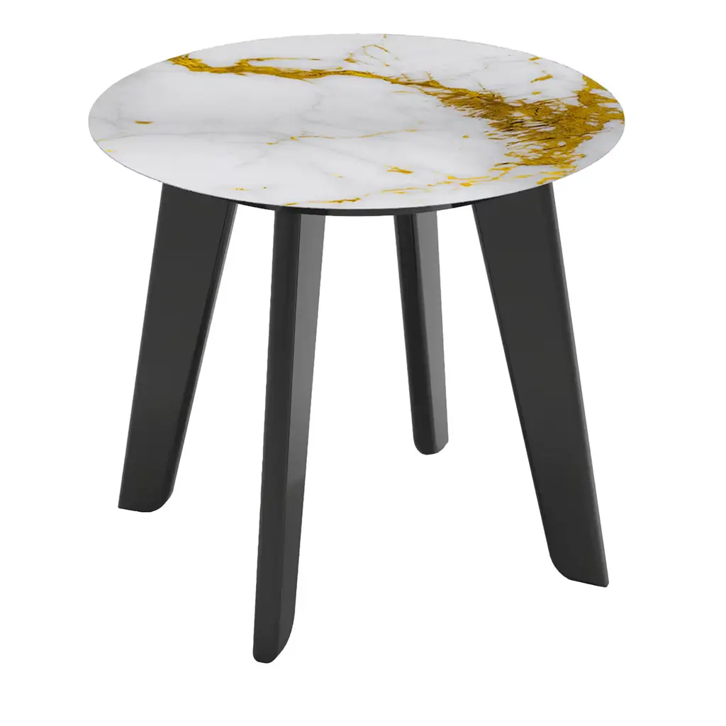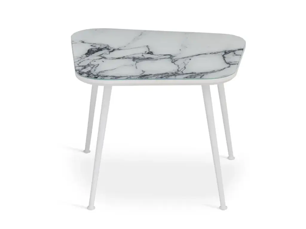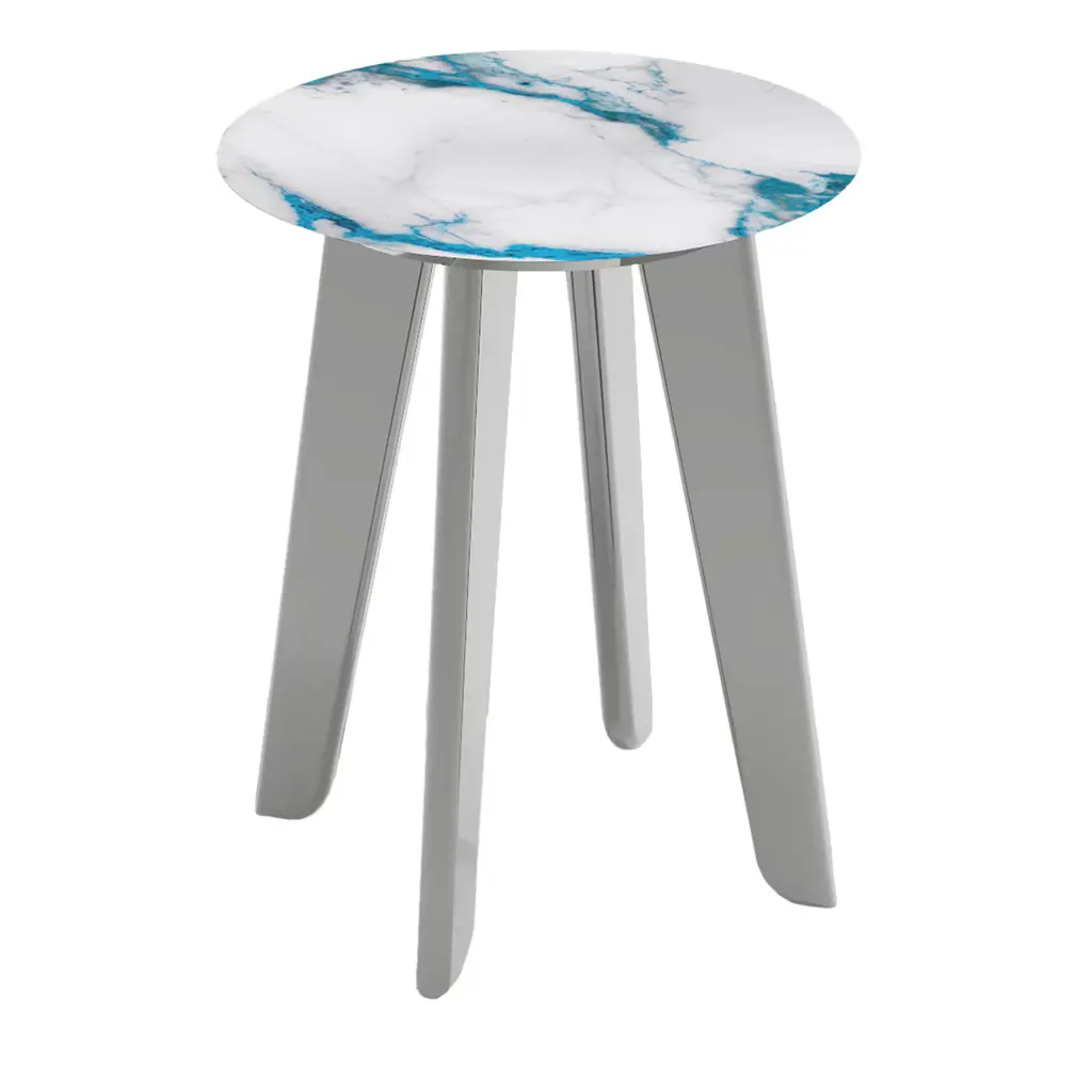 Either showcased alone or paired with others from the same series for a dynamic effect, this side table is defined by a stunning interplay of contrasts and balances in its vivid hues and clean design. Resting on wooden legs finished with a satin black metal lacquer, the white top boasts a striking, marble-like, turquoise veining characteristic of Vetrite, a glass composite patented by Sicis. This piece is available with polished legs upon request to the Concierge.