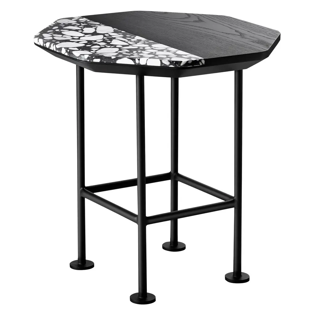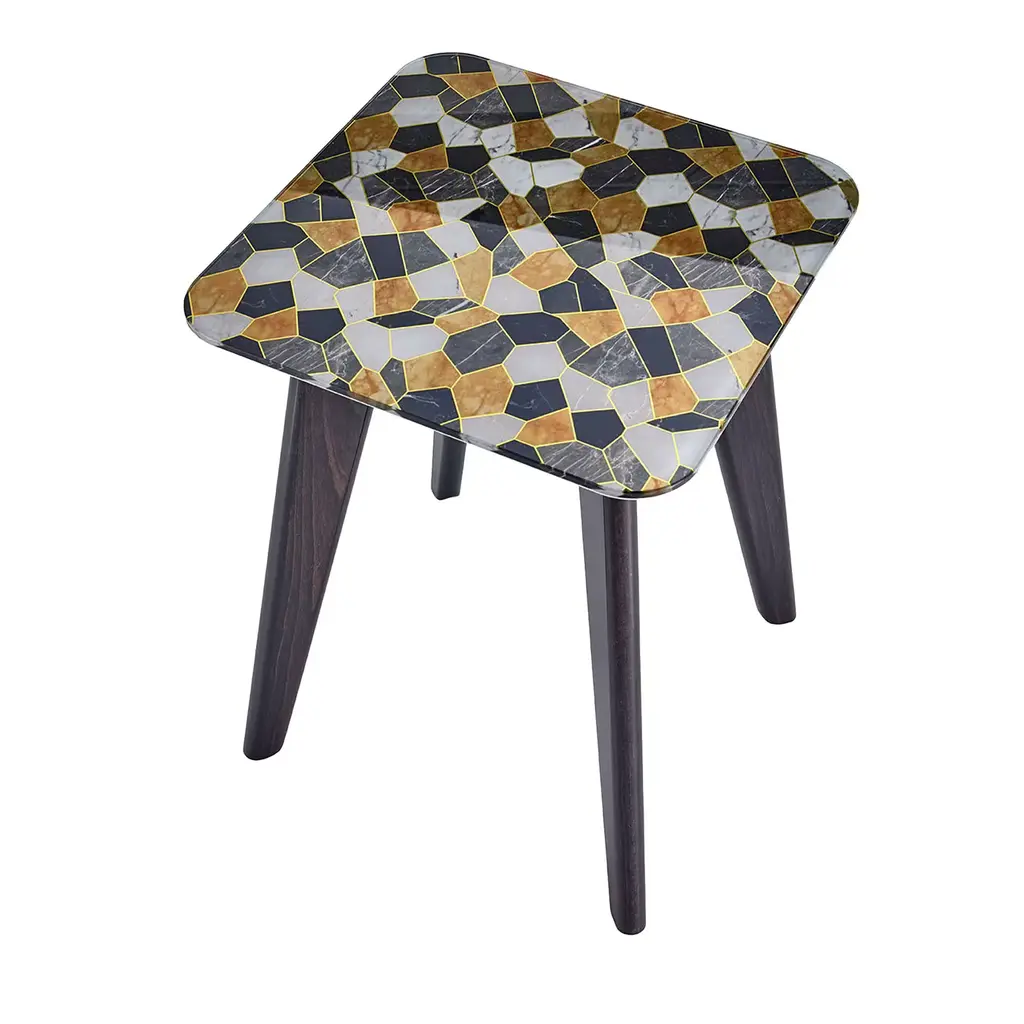 Part of an elegant and creative collection of pieces, this side table will infuse any room of both a private or contract interior with eclectic sophistication. Resting on wooden legs lacquered in a satin black metal finish, it boasts a strikingly patterned square top fashioned of Vetrite, a patented Sicis material composed of glass slabs made of special polymers. Available with polished legs upon request to the Concierge.