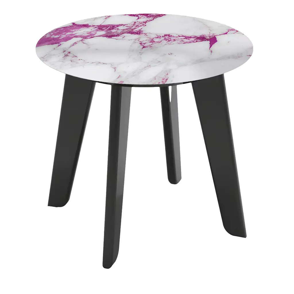 An exceptional design piece for modern commercial and residential interiors alike, this side table boasts a clean and essential flair enhanced with a stunningly decorated top. Fashioned of Vetrite, a glass composite of special polymers patented by Sicis, it features a marble-like veining merging gray and white hues in a timeless design. The top rests on wooden legs lacquered with a satin black metal lacquer, also available in a polished version upon request.